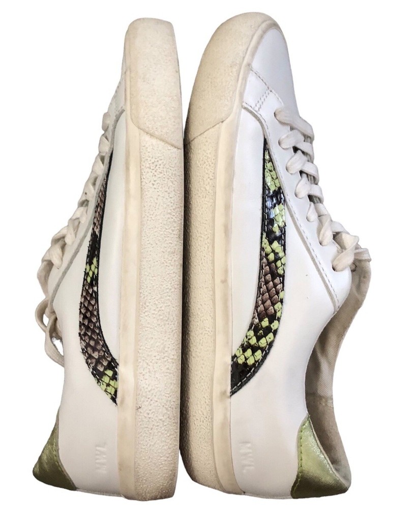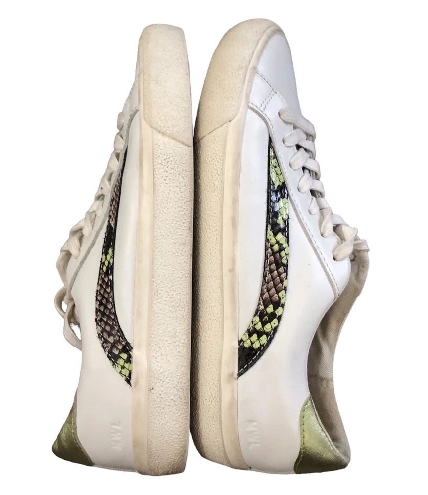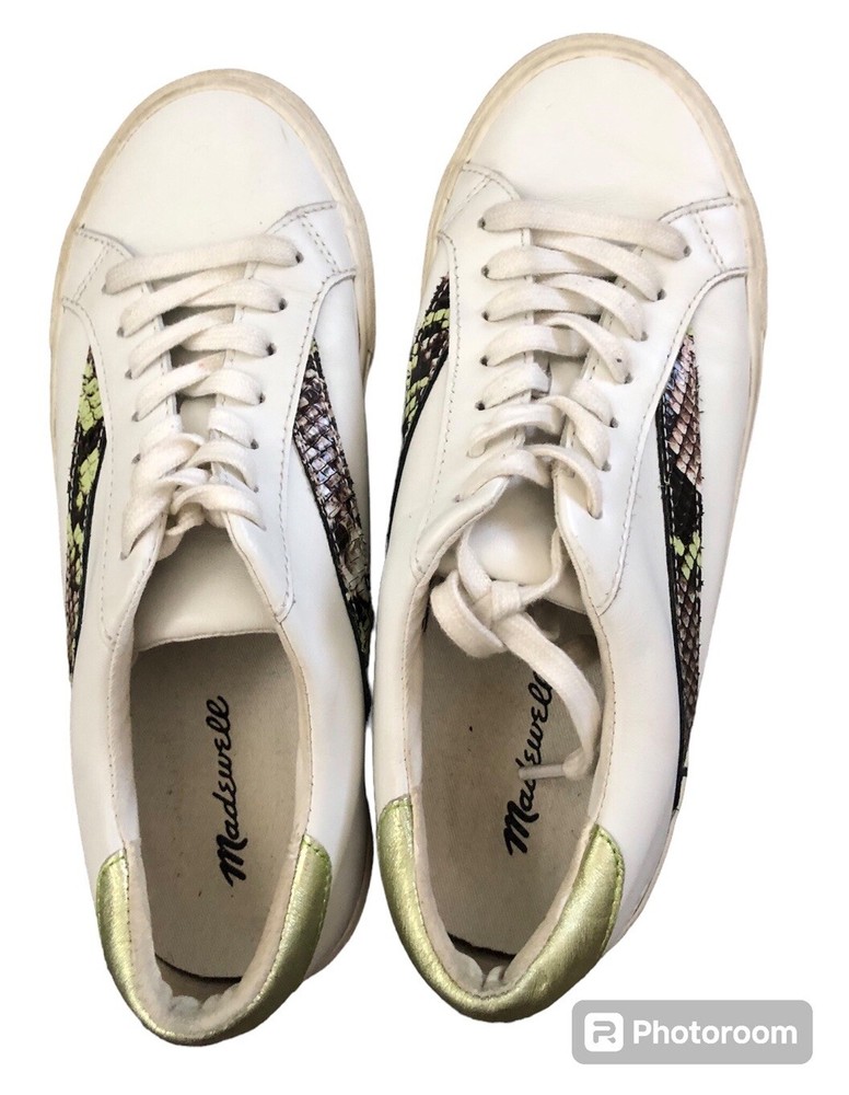 Elevate your sneaker game with these Madewell Sidewalk Snake Embossed sneakers. The white leather upper features a stylish colorblock pattern with snake-themed detailing. Lace-up closure ensures a secure fit while the low top design provides freedom of movement. These sneakers are perfect for any casual occasion and are sure to turn heads. The size 7.5 US sneakers have a medium width and are made with high-quality leather materials. The Madewell brand is known for their unique and fashionable designs, and these sneakers are no exception. Whether you're running errands or hanging out with friends, these sneakers will keep you comfortable and stylish. Preowned. Minor signs of wear.