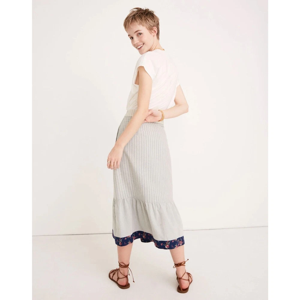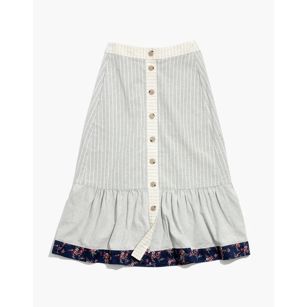 Madewell x The New Denim Project Boho 70's Ruffle Patchwork Button Midi Skirt Size 2. WLF 14.5 inches, length 31 inches. Based in Guatemala, The New Denim Project takes textile leftovers from mills and upcycles them into brand-new fabric (even their manufacturing waste gets turned into compost for local coffee beans). We teamed up on a feel-good capsule inspired by homespun '70s handwork—this button-front midi skirt mixes stripes with floral print and has a retro ruffled hem. 100% Cotton. Excellent used condition, no flaws noted. Please don't hesitate to ask any further questions. Smoke free pet friendly home. Check out my other listings for a bundle deal! Boho 70's Ruffle Prairie Patchwork