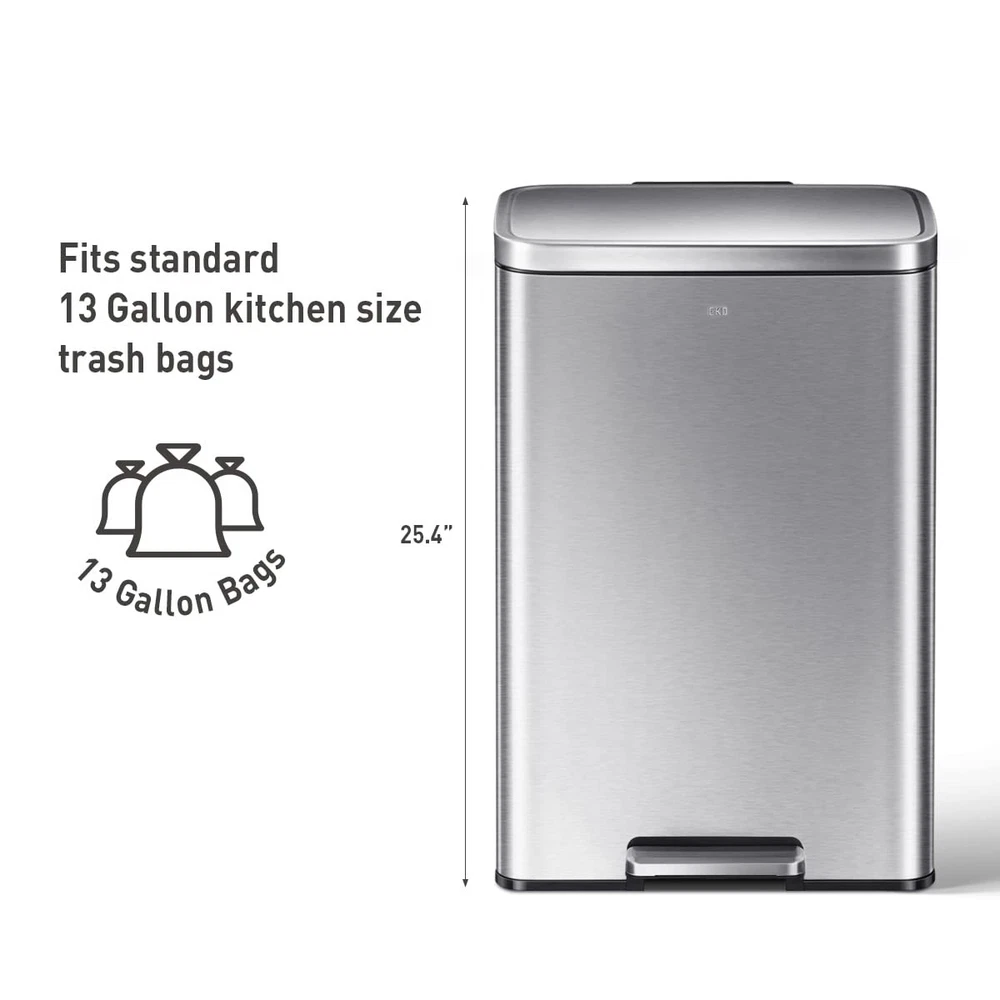 The Madison rectangular step trash can is constructed of fingerprint-resistant brushed stainless steel for a sleek appearance that complements your living spaces without drawing attention to your trash can. The rugged step pedal mechanism is built to withstand years of daily use, and the bi-force damper soft open and close lid prevents slamming and banging. Stay open locking lid allows you to hold the lid open longer when necessary. Use your favorite deodorizer in the built-in compartment on the underside of the lid to keep your kitchen smelling fresh between bag changes. The removable polypropylene inner liner has a cut out bag fixer slot to tuck in your trash bag so it won't slip down into the can. Generous 50L (13.2 Gallon) capacity takes standard kitchen trash bags so no special orders required. Look for extra-strong 13G trash bags EK33706B for leak-proof protection that is 10% thicker than competitor's bags. US based customer support team. Dimensions: 16.9"W x 14.3"D x 25.4"H. Height with lid open: 36.6" Superior Stainless Steel Build- This heavy-duty stainless steel garbage can boasts an ultimate fingerprint-resistant stainless steel construction that provides a versatile and stylish waste disposal solution perfect for the home, office or other spaces. Whisper-quiet Closing - The rugged step pedal mechanism is built to withstand years of daily use, and the bi-force damper soft open and close lid prevents slamming and banging. Stay Open and Do Your Thing - This kitchen garbage can boasts an easy-to-use lid lock, ensuring it stays open as long as needed. Quality Construction Built to Endure - Our durable stainless steel foot pedal is built to last over 200,000 times, ensuring smooth and reliable operation for years to come! Elevated Inner Bucket with Handles: The Madison stainless trash can features a raised inner bucket with convenient handles, ensuring swift and hassle-free bag replacement.