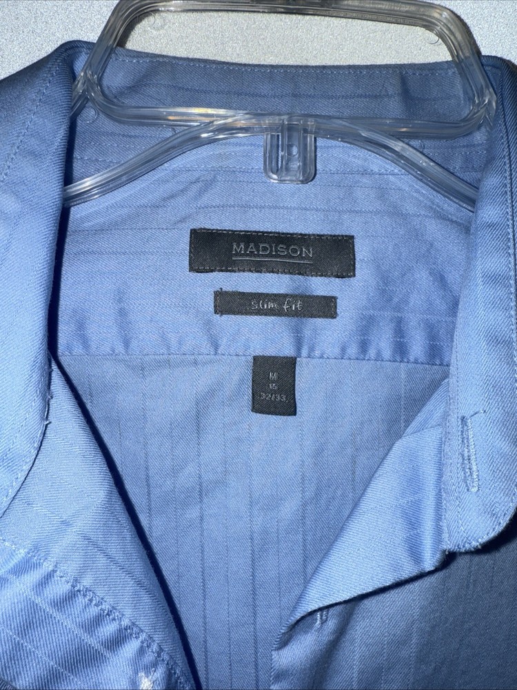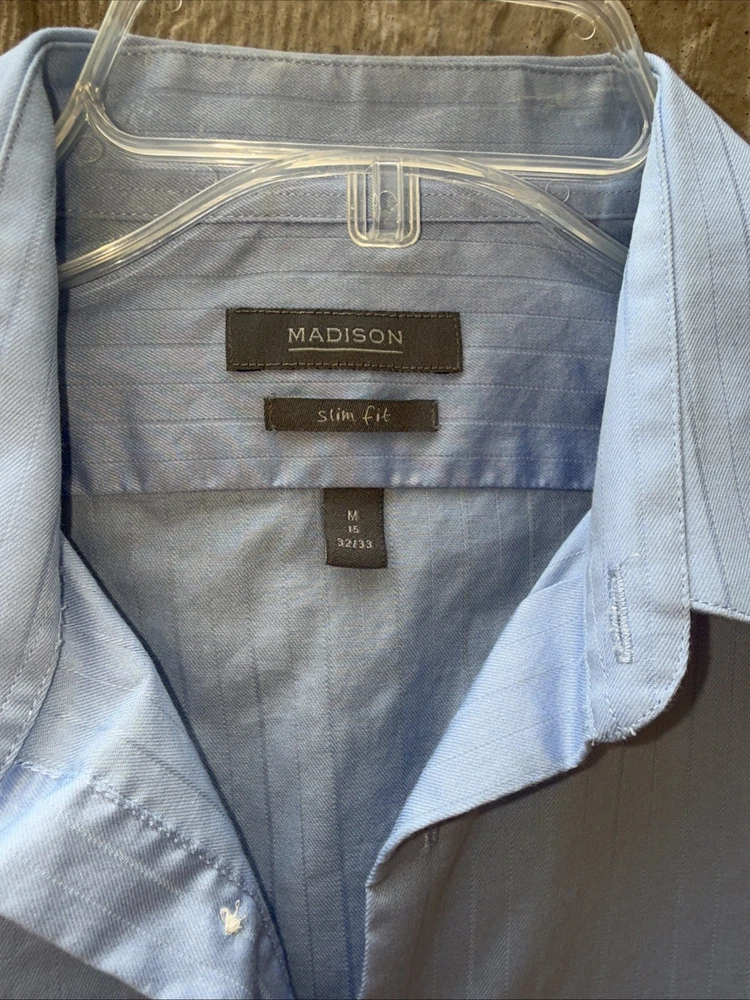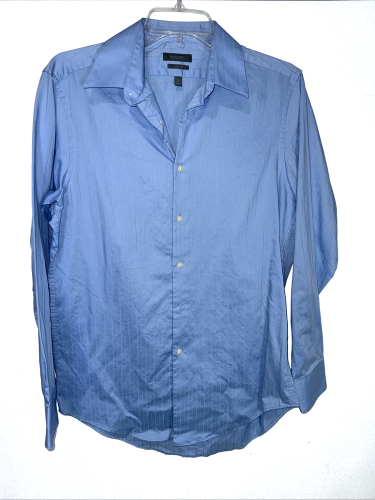 The Madison Men's Shirts in Sky Blu, size M, feature a classic collared design with long sleeves and a slim fit. Made from 100% cotton with a medium level fabric wash, these button-up shirts are suitable for casual, formal, and business occasions. The solid blue color and barrel cuff style add a touch of sophistication to this timeless piece of men's clothing. With the brand's reputation for quality and style, these shirts are a perfect choice for the modern man looking for a versatile wardrobe staple.