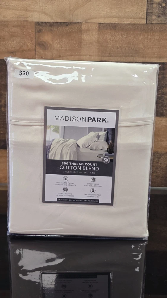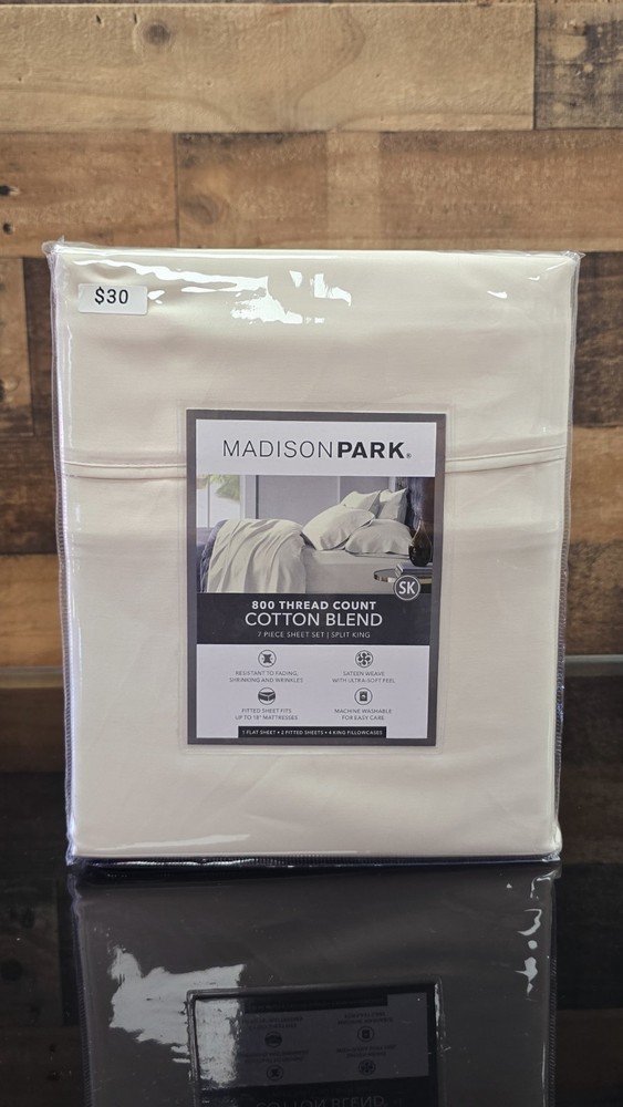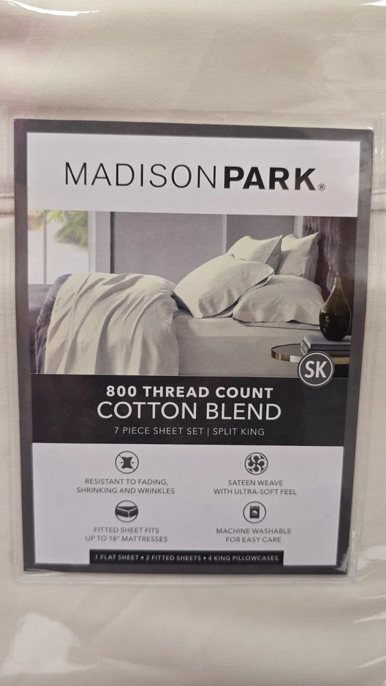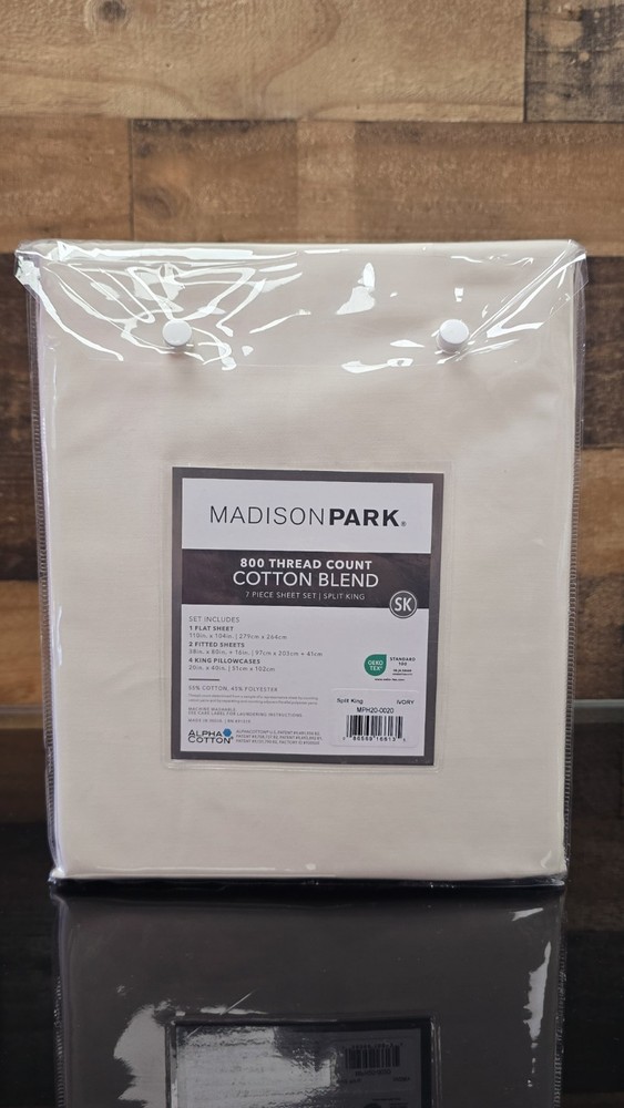 Elevate your bedding experience with the Madison Park 800 Thread Count Cotton Blend Sheet Set, designed to provide both comfort and elegance. This Split King set includes a flat sheet, fitted sheet, and two pillowcases, all in a versatile ivory color that complements any bedroom decor. Crafted from a premium cotton blend, these sheets offer a smooth, breathable feel that's ideal for all-season use.The set's modern style is enhanced by its practical features, such as deep pockets for a secure fit on your mattress, and wrinkle resistance for a sleek appearance. It also boasts hypoallergenic and anti-microbial properties, ensuring a clean and healthy sleeping environment. Easy care is promised with machine wash instructions, while the STANDARD 100 by OEKO-TEX certification denotes quality and safety.