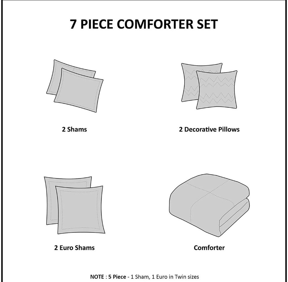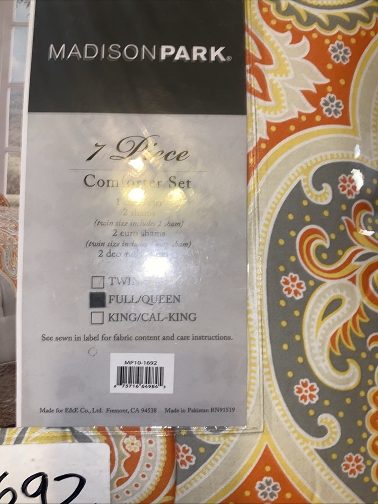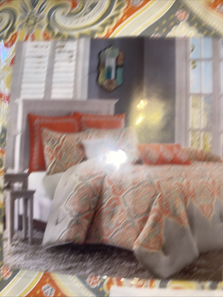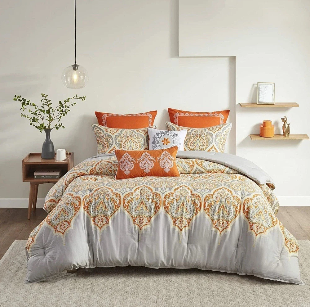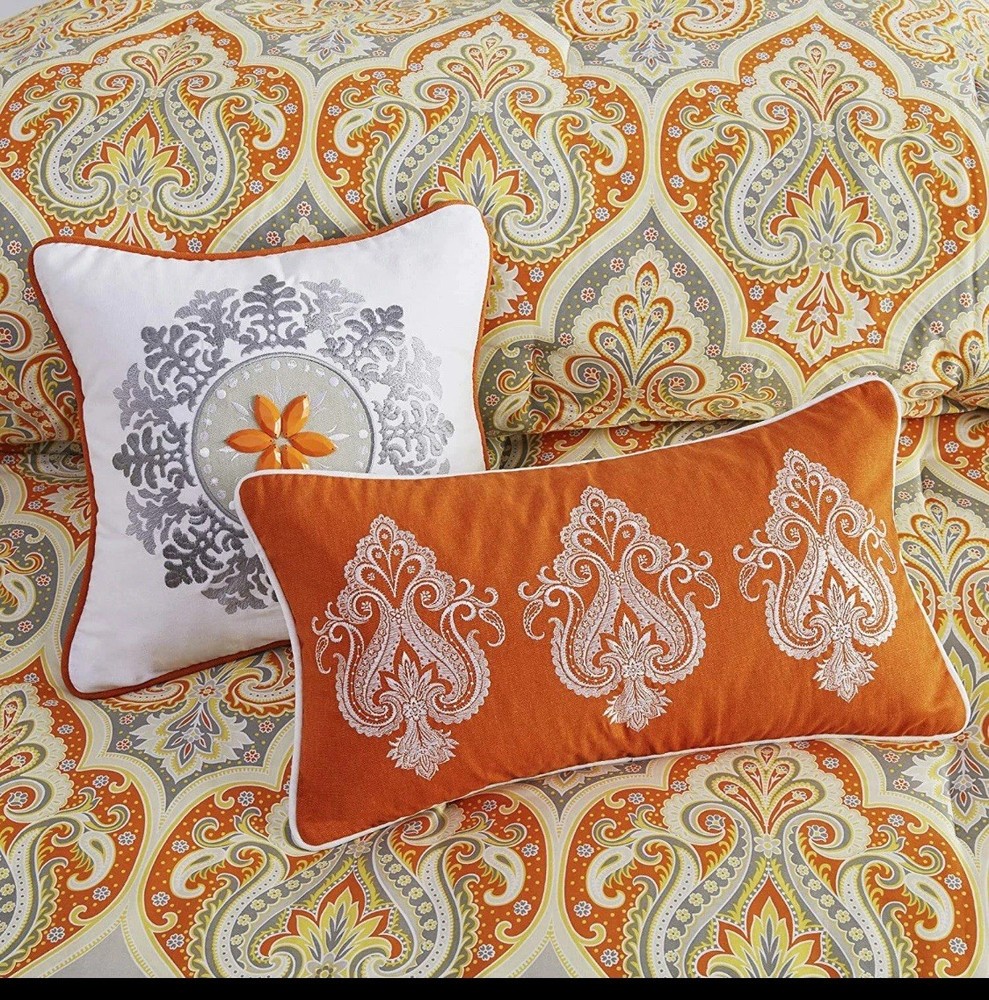 The Madison Park Nisha 7-Piece Full/Queen Comforter Set in Orange is a stylish and comfortable bedding set designed by Olliix. The set includes a decorative pillow, pillow sham, euro shams, and a comforter, all in a rich orange color with a paisley pattern. Made from 100% cotton with 100% polyester fill, this set provides a luxurious feel to any bedroom. The comforter is 90 inches in length and width, making it perfect for a full or queen-sized bed.
