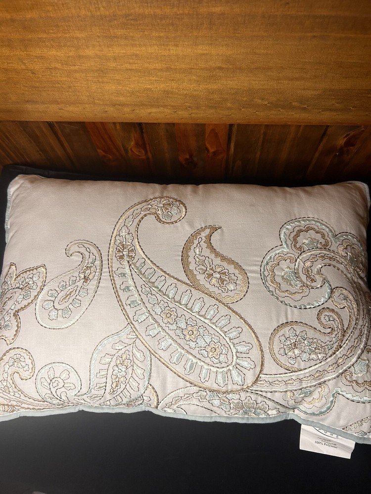 The Madison Park Pure Paisley Design Pillow features a white background with a stunning paisley pattern in shades of blue and gold. Measuring 17 inches by 11 inches, this decorative pillow is a stylish addition to any home decor. Perfect for adding a touch of sophistication and elegance to a living room or bedroom, this pillow is designed to enhance the aesthetic appeal of the space.