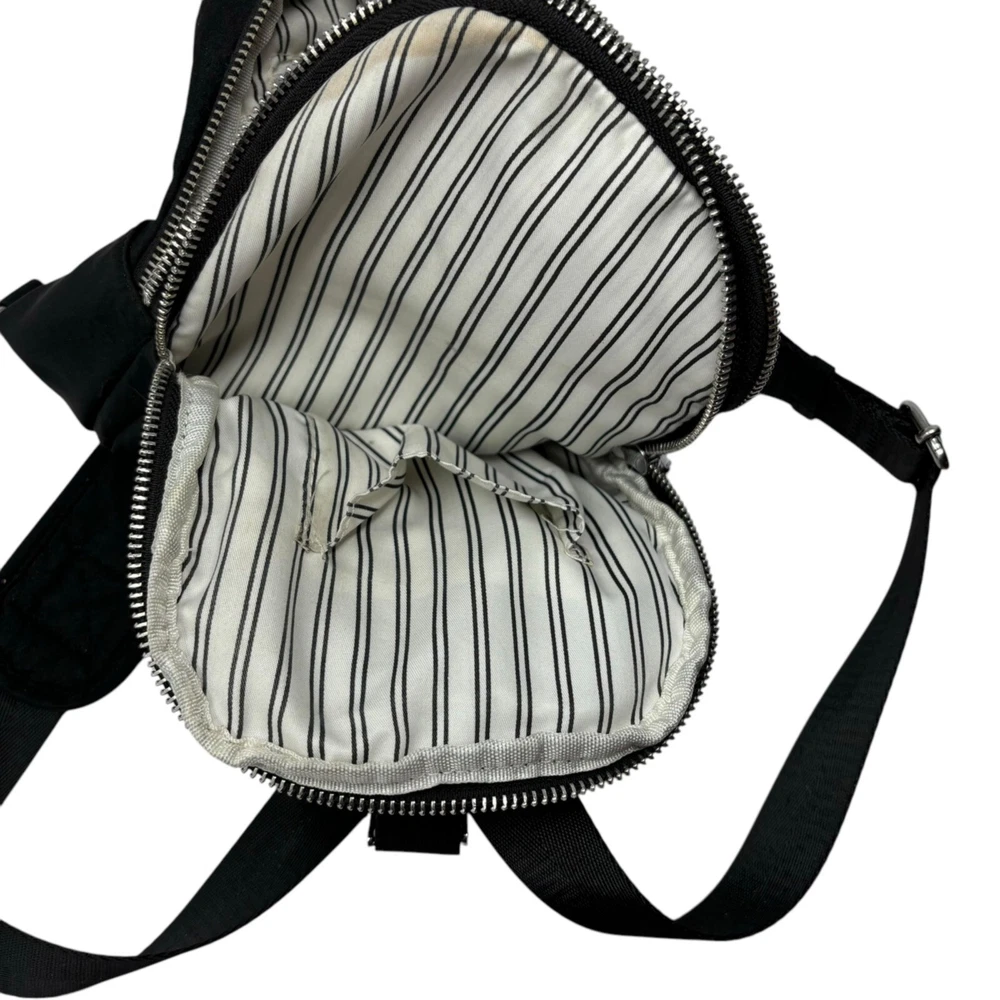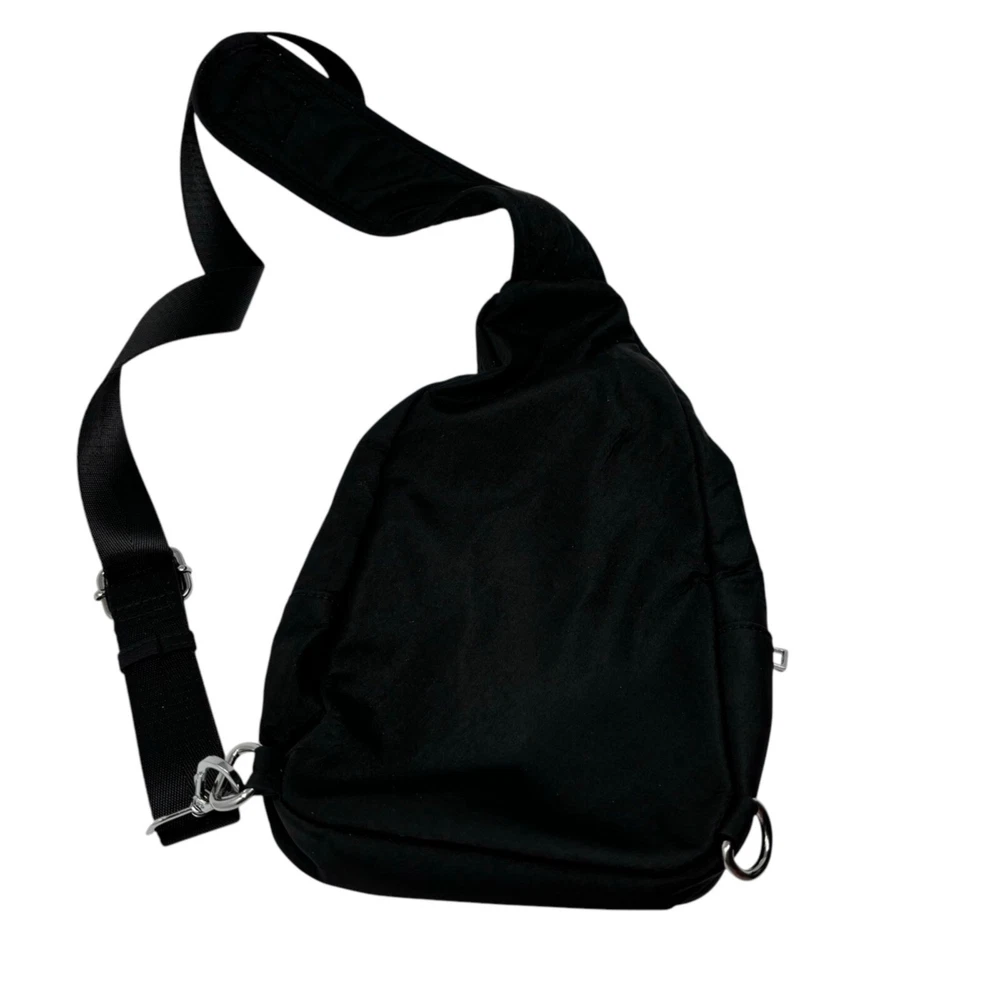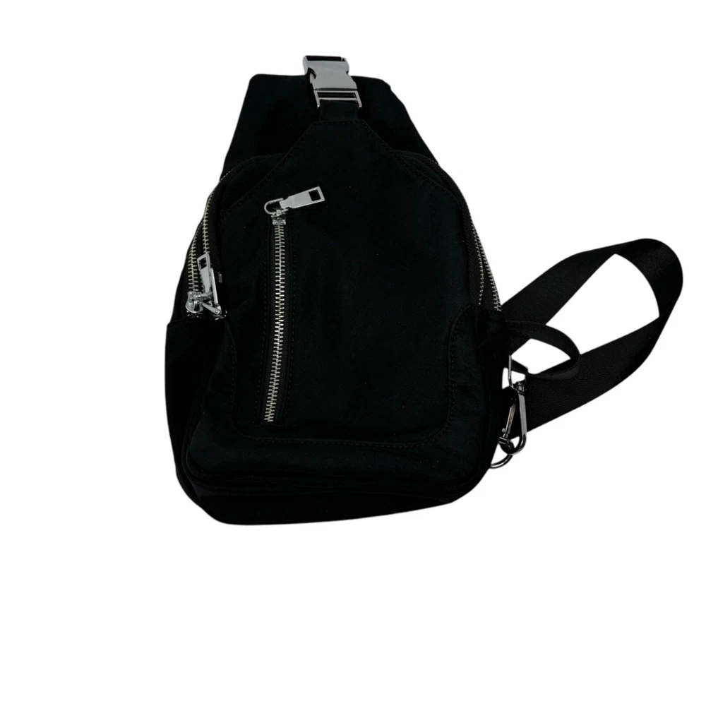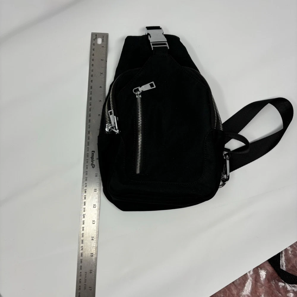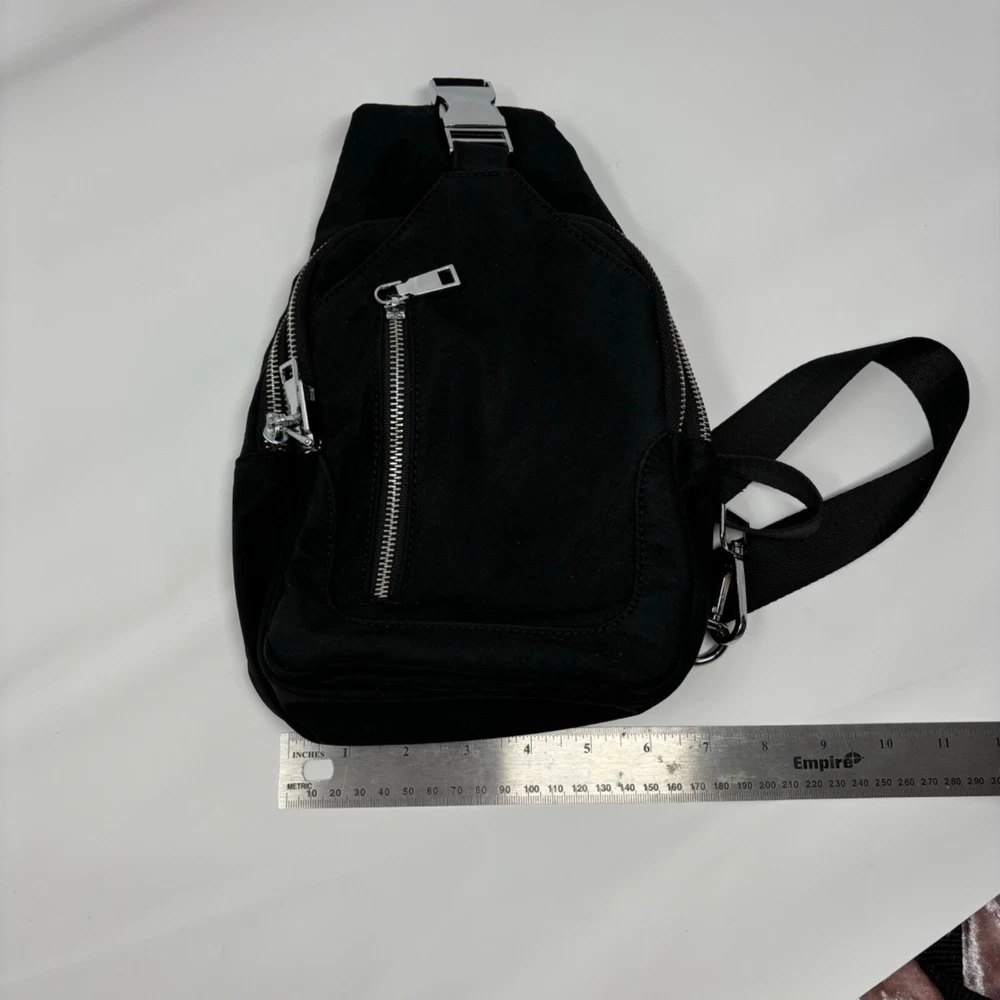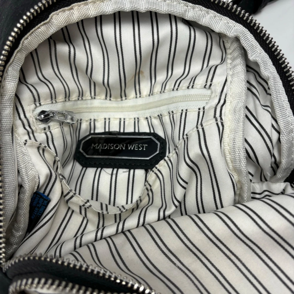 The Madison West sling backpack is designed for everyday convenience. Its compact size and adjustable strap make it easy to carry essentials. • Zipper closures for secure storage • Adjustable shoulder strap for comfort • Lined interior with additional pocket • Compact size for daily use No visible condition flaws. Measurements: Length = 11 inches, Width = 8 inches, Depth = 3 inches.