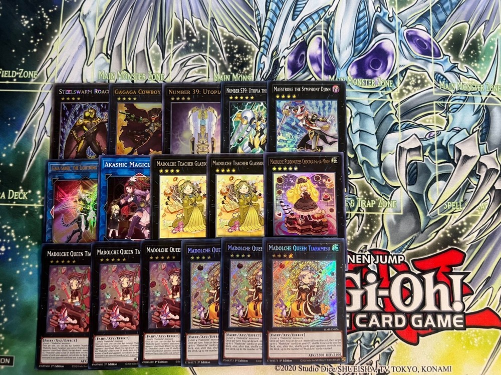 Hello! You are purchasing the deck list below, the cards will be English, real, and near mint to light play condition at worst. All decks are built with the lowest rarities for cards in mind to keep the price of the deck low and affordable for all duelists! Some cards may be in speed duel printing if this is the cheapest available copy of the card, but do not worry these are real cards and legal for tournament use! Purchase with confidence and safety! As an added bonus one pack of card sleeves will be included with your deck! Thanks again and good luck dueling! Now here's the decklist; Monsters: 1| Madolche Chouxvalier 1| Madolche Puddingcess 3| Ash Blossom & Joyous Spring 3| Effect Veiler 3| Madolche Messengelato 3| Madolche Anjelly 3| Madolche Hootcake 3| Madolche Magileine Spells; 1| Monster Reborn 1| Called By The Grave 3| Twin Twisters 3| Dark Hole 3| Madolche Salon 3| Madolche Chateau 3| Madolche Ticket Traps: 1| Madolche Tea Break 1| Madolche Promenade 3| Madolche Nights 3| Solemn Warning Extra Deck; 1| Akashic Magician 1| Gaia Saber, The Lightning Shadow 1| Maestroke The Symphony Djinn 1| Number S39: Utopia The Lightning 1| Number 39: Utopia 1| Gagaga Cowboy 1| Steelswarm Roach 1| Madolche Puddingcess Chocolat-A-La-Mode 2| Madolche Teacher Glassouffle 3| Madolche Queen Tiaramisu 3| Madolche Queen Tiarafraise