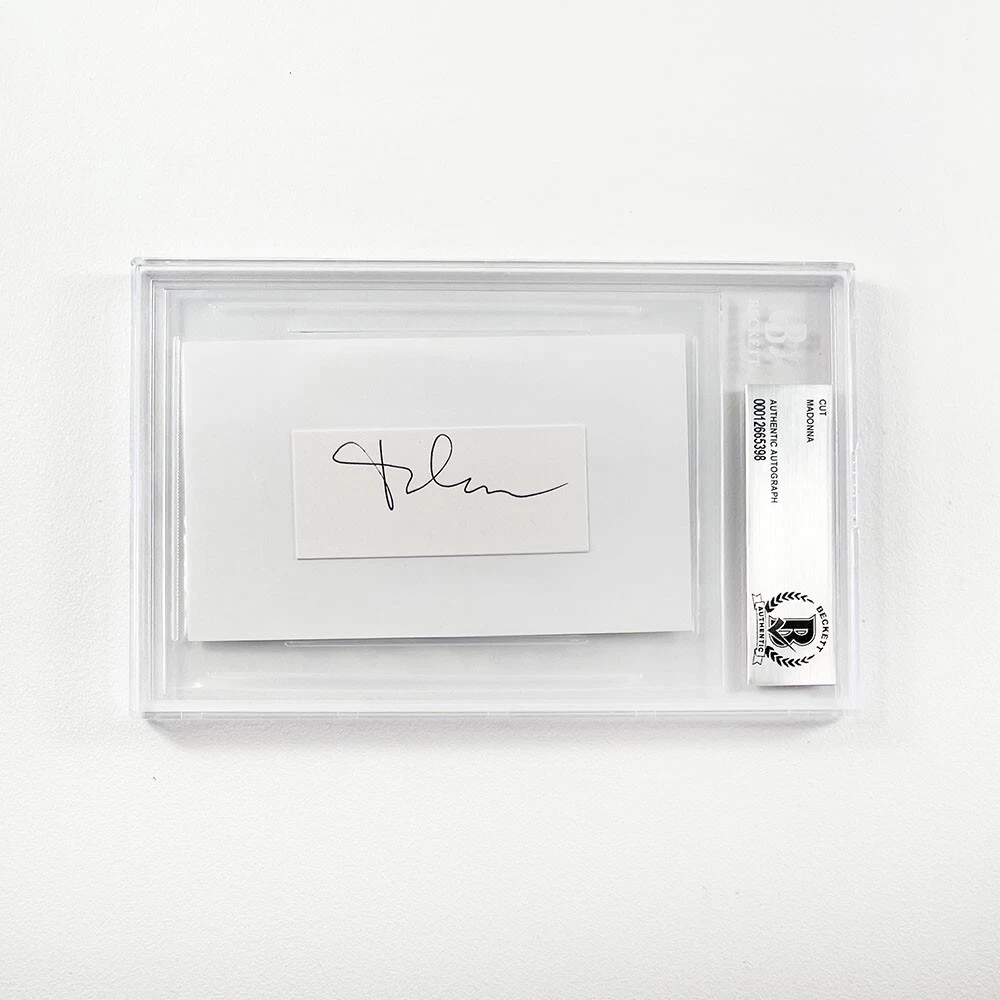 DESCRIPTION A 3x5 inch card signed by Madonna. Autographed in-person card. She is very diffcult to obtain. This is Encapsulated and certified authentic by Beckett Authentication Services (BAS).(BGS). Certification number- 00012665398 Items are typically in excellent condition. We do our best to accurately describe every item. Any item not in excellent condition will be described as such. Please use the images as a guide to condition. Note: some photos may have random writing or stickers on the back and tiny imperfections from the signing process. This autographed item is authentically hand-signed and is 100% guaranteed authentic forever. Certified authentic by Beckett Authentication Services (BAS). Includes their serialized COA and matching, tamper-proof, serialized sticker on the item (the sticker may be affixed to the back of the item). Making Best Offers: All reasonable offers will be considered. However, ridiculous offers will be ignored. Please, make a fair offer. You must use the eBay make an offer process. Do not email us to ask best price. *Any listing errors, including, but not limited to, typographical, image or pricing render any sale null and void. When purchasing this item, you agree to all terms set forth in the description. SHIPPING We ship worldwide via USPS and FedEx (some countries are disallowed) and have loyal customers worldwide. OUTSIDE THE USA* **: Ebay's International Shipping Service is active. Please see the item shipping details for international shipping costs. *International customers please Note: Import duties, taxes, and charges are not included in the item price or shipping cost. These charges are the buyer's responsibility. With Ebay's International Shipping Service, Import charges should be collected from the buyer at checkout. If not, on delivery, either through customs or directly by the carrier. These charges include any customs duties, taxes, brokerage, and other fees. Please check with your country's customs office to determine what these additional costs will be prior to bidding or buying. Ebay now charges sellers an 'international payment fee' on all payments made in any currency that is not in $USD. **Please note: dissimilar items will likely have to be shipped separately. PAYMENT DETAILS We accept PayPal, PayPal Credit, Most Major Credit Cards, Apple Pay and Google Pay (Whatever options eBay offers to you.). Payment is expected immediately. *Please note that if an item remains unpaid after 4 days, eBay's system automatically cancels the order. RETURN POLICY All sales are final with the exception of items significantly not as described. These items may be returned within 14 days of receipt. Autographed items are guaranteed authentic for the life of the item and are not bound by our 14 day return policy. Third party expert certified items are exempt. Other limitations apply. Please ask for details. In all cases, you must contact us for return authorization before returning any item. *Please note that due to a payment industry rule change, payment processing fees are no longer refunded to merchants. As such, they must be deducted from any refunds. PACKAGING Photo - placed in acid free, archival quality, polypropylene protective sleeves, safely packaged between cardboard and shipped in a special rigid mailer. Labeled 'do not bend'. Funko Pop - placed in a plastic pop protector and then securely boxed with generous amounts of cushioning material. The box is marked 'Fragile'. Record album - placed in acid free, archival quality, polypropylene protective sleeves, packaged in a special record album mailer and marked 'do not bend' and 'fragile'. Other collectibles - placed in protective packaging then boxed with generous amounts of cushioning material. The box is marked 'Fragile'. In all cases, our simple desire is that your item arrives safely! OUR CUSTOMER SERVICE PHILOSOPHY We want your shopping experience with us to be exceptional and we strive to create customers for life. At World of Autographs, we know that positive word of mouth grows our business and no sale is ever complete until you are 100% satisfied. Sometimes, on a rare occasion, factors out of our control may lead to a less than perfect experience. Please let us know so we can help. In all instances, simply contact us and we will do our best to resolve any issues to your satisfaction. ABOUT US World of Autographs has collected and sold authentic autographs since 1992 with one simple purpose: to deal only in high quality, collector grade, 100% authentic autographs and memorabilia. We are AFTAL Approved Dealer #AD123 and members, 'in good standing' of the UACC. We have become one of the top-respected dealers in contemporary autographs. World of Autographs is a leading supplier of authentic memorabilia to private collectors, dealers, galleries and auction houses worldwide. Our autographs are obtained, in-person, in places such as New York City, Chicago, Los Angeles and London. We occasionally source from private signings and purchase rare vintage items. Our autographs have a lifetime guarantee of authenticity and many come with the additional peace of mind of 3rd party authentication. In the current market, you need to be very cautious when buying autographed items. Much of what you see for sale are forgeries. Buy from us and never have to worry. We never sell 'pre-prints/re-prints' or 'copies' and all of our photos / products are high quality. Our authentic collectibles make fantastic additions to any collection as well as unique gifts for that special person or client. Why not add one or more to your authentic collection today? © Copyright 2024 World of Autographs