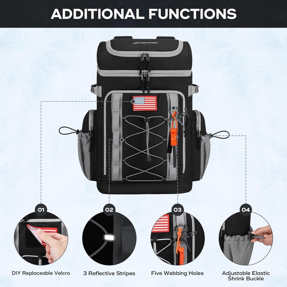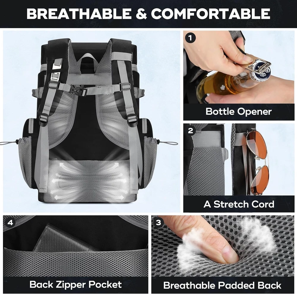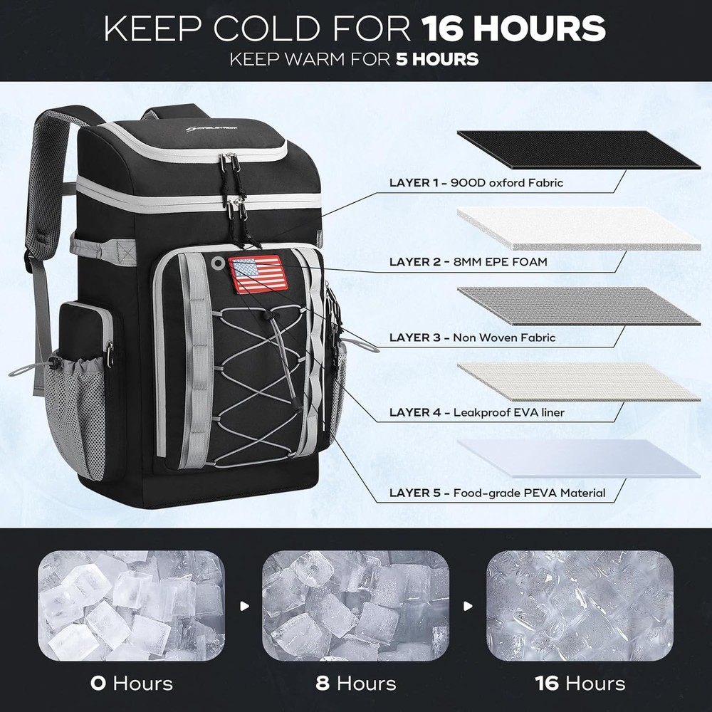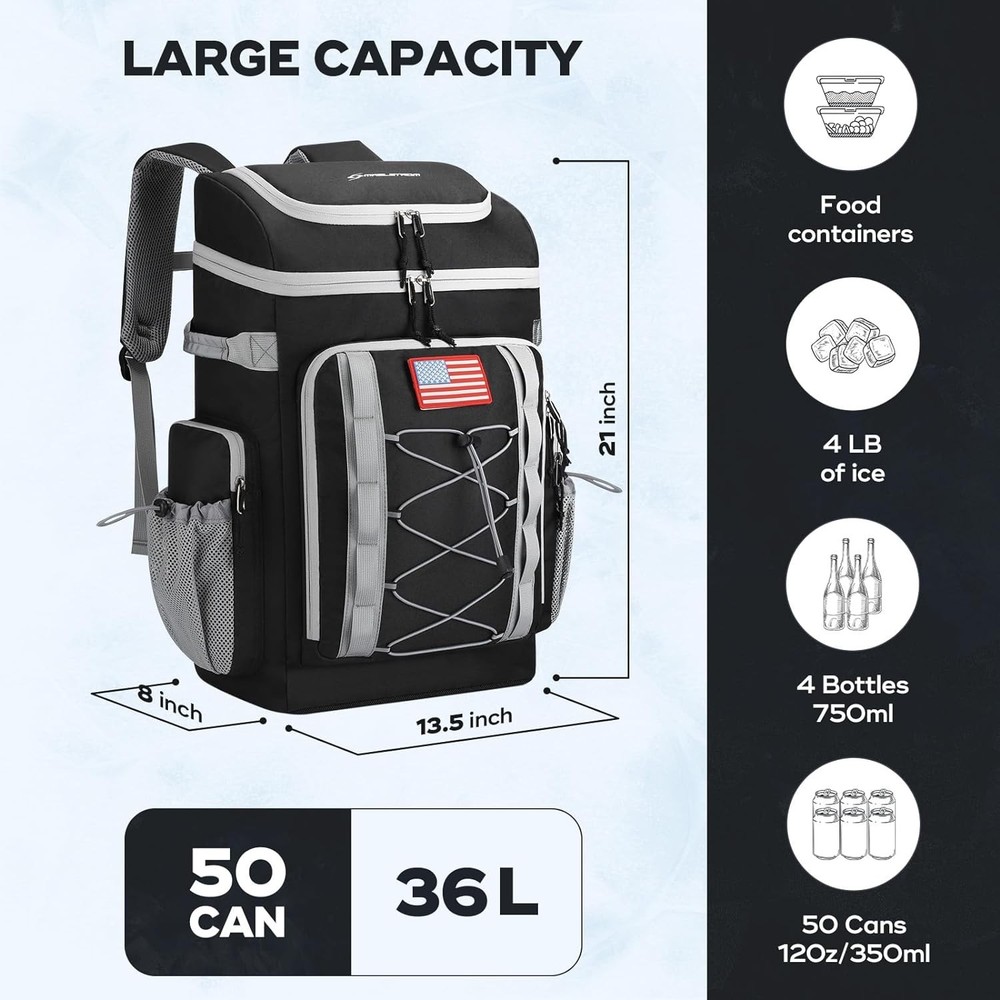 Maelstrom Backpack Cooler,Soft Lightweight Leakproof Cooler 50 can, Black Product Details Brand: Maelstrom Color: Black Material: Polyester Package Information: Bag Capacity: 36 Liters Product Dimensions: 13.5"D x 8"W x 21"H Item Weight: 2.4 Pounds Special Feature: Leak Proof, Lightweight, Adjustable Strap Included Components: no Model Name: MSCBP03 Product Care Instructions: Hand Wash Insulation Material: Polyethylene Chamber Depth: 13.5 Inches Size: 50 can Manufacturer: Maelstrom Item Weight: 2.4 pounds Department: unisex-adult Country of Origin: China Item model number: MSCBP03 16h INSULATION & LEAK PROOF: Soft cooler backpack features high density insulated padded material and an upgraded leak-proof liner to ensure leak-proof and keep food hot/cool for 16 hours;great for beach picnics, hiking, camping, traveling, boating, baseball/golf tournaments, and work MULTIPLE COMPARTMENTS: Multiple compartments: 2 compartments for cool drinks and fruit, front zipped pocket for storing your crockery, 2 large side pockets and mesh pocket ideal for storing wine or water bottles. There are also hidden pockets on the back for your mobile phone and valuables! DURABLE & ERGONOMIC DESIGN: This lunch backpack is made of heavy-duty nylon that won't rip, yet is lightweight and easy to carry. It also has adjustable shoulder straps and an ergonomic design with a padded, shock absorbing foam back ,making the journey more comfortable MORE FEATURES: Designed with 10 webbing holes to hang keys, water bottles and other tools. There is a stretch cord on the shoulder strap to hang sunglasses and a bottle opener for easy opening of beers and drinks. The front pocket has a Hook-and-Loop strap for attaching a flag or other icons for more personalization LARGE CAPACITY: The backpack cooler size 21" x 13.5" x 8" (L x W x H), weighs 1210g, and the main pocket holds 50 cans (36 liters) of beverages, which is plenty of room for a full meal, beers, drinks, snacks and other essentials. A perfect gift for both men and women! Maelstrom soft backpack for lunch, picnic, hiking, beach, park Whether you have strong interest in beach trip, road trip, picnics or daily hiking, Maelstrom insulated cooler backpack is your best partner for lunch to work and all kinds of outdoor activities. Large Capacity Backpack Cooler Backpack capacity:24 L Capacity of main bag:35 cans Size:11.8*7.1*17.7" Multi Compartments and Keep Things Organized 1 Main storage compartment is large enough to provide roomy capacity for your beers, juice, sandwiches or other food. 1 front zipper pocket, which can be used to store electronic products such as IPAD and charging cables. 1 front elastic rope net, which can put picnic mats and other items. 1 front cutlery storage bag can hold 9 knives or forks and more than 10 dishes and fasten them firmly. Two condiment bottles can be placed on the top of the tableware storage bag for easy access. 1 top zipper pocket, which can put cell phones, snacks, etc. 2 mesh side pockets for water bottles. Both mesh side pockets are equipped with adjustable elastic shrink buckles,which can be adjusted to a suitable size according to needs to play a fixed role. 1 hidden back zipper pocket, which can put valuables such as mobile phones or wallets. 1 shoulder strap card pocket,which can put bank cards, bus cards, etc. Keep Your Food Cool/ Fresh/ Hot and 100% Leak Resistant This insulated backpack is made of premium thicken PEVA hot-pressed material to keep your drinks and snacks cool for hours temperature below 15℃(with Freeze Packs). The inner thicken foam insulation and heat-sealed leak proof lining work together to make the beach cooler anti-leaking, without worrying about leaking, dripping or any watery spills or mess.