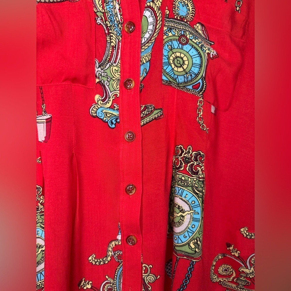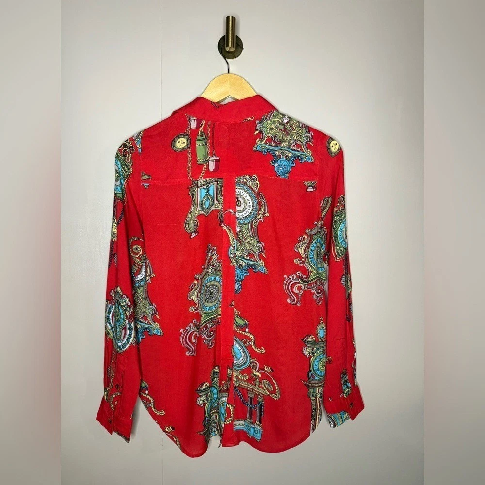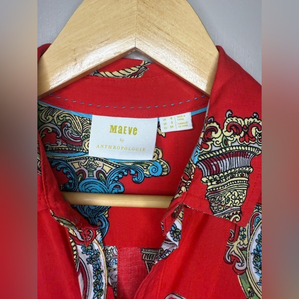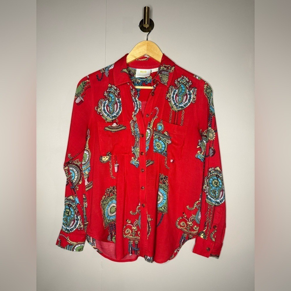 Maeve for Anthropologie featuring an ornate baroque and medallion print with chain and clock detailing. Lightweight and fluid with a polished yet playful feel. This piece is perfect for dressing up denim, layering under blazers, or styling with faux leather and boots for an elevated boutique look. The vibrant red base paired with turquoise, gold, and cream accents gives this top strong statement energy while still being versatile enough for everyday wear. A great piece for capsule wardrobes, resort styling, or bold casual outfits. Details: Brand: Maeve by Anthropologie Size: 2 Color: Red with multicolor baroque print Button front closure Long sleeves with button cuffs Chest pocket Lightweight woven fabric Measurements: Pit to Pit: 18.5 in Length: 26 in Condition: Excellent pre-owned condition. All buttons intact. No flaws noted. Model image was created using AI for styling and visualization purposes only.*