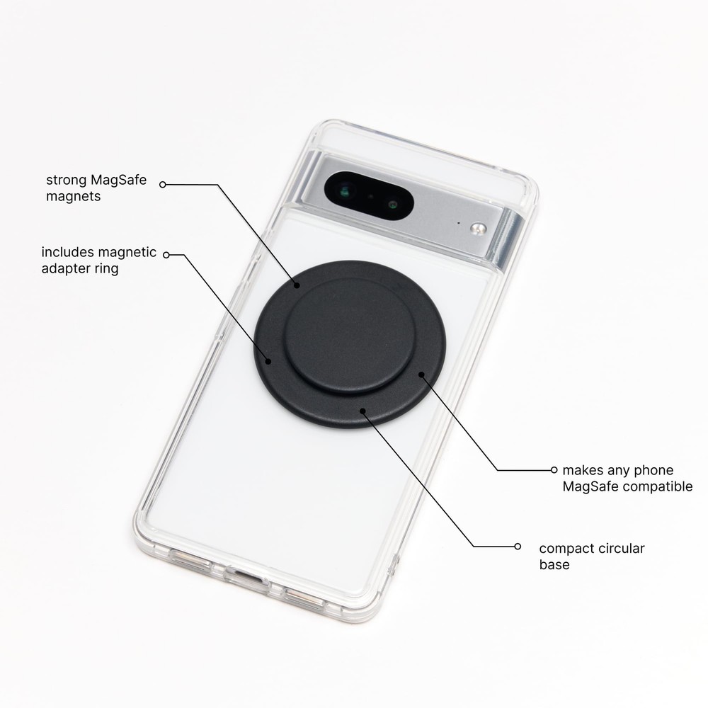 This grip is a game-changer! The MagSafe magnets are super strong, so I never worry about my phone falling. Love that it works with all my devices thanks to the included adapter ring—super versatile. Wireless charging still works flawlessly, and it snaps on/off easily. The only downside is it won’t stick to silicone cases, but otherwise, it’s perfect. Super sturdy and sleek in black! Highly recommend for anyone who wants a secure grip without sacrificing convenience.