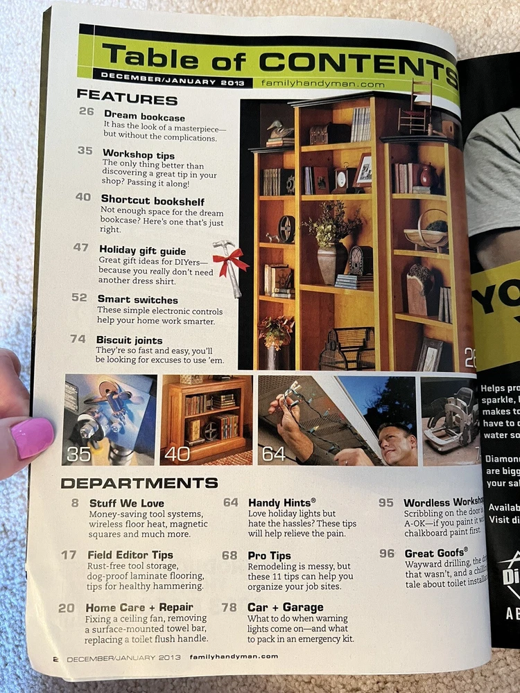 Publication Month: December, January Publication Name: Family Handyman Publication Frequency: Monthly Topic: Home Improvement Genre: Home Improvement, Craft, Design, Hobbies & Crafts, Home & Garden Publication Year: 2013 Language: English