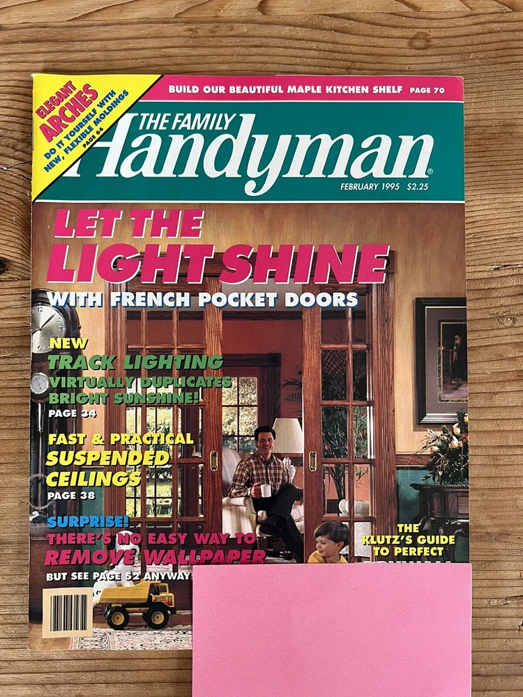 MAGAZINE TITLE : The Family Handyman Let the Light Shine - with French Pocket Doors New Track Lighting virtually duplicates bright sunshine Fast & Practical Suspended Ceilings Surprise! There's no easy way to remove wallpaper The Klutz's Guide to perfect Drywall Joints Build our beautiful maple kitchen shelf FORMAT : Magazine PUBLICATION DATE : February1995 CONDITION : Excellent condition for age - not sure it was ever read. Been sitting on a shelf. Some discoloration of pages. Pink notecard covering name/address label in photo PAYMENT : Payment is due within 3 days of the end of the auction. SHIPPING : Shipping is via US Post Office ONLY. RETURN POLICY : I list items to the best of my ability and try to describe each item as best as possible. Items that were grossly misrepresented may be returned for a refund of bid price only (I will not refund any postage). Refunds will be issued once I receive the item back. Please check out my other items - I will gladly combine shipping! Email me if you have any questions.
