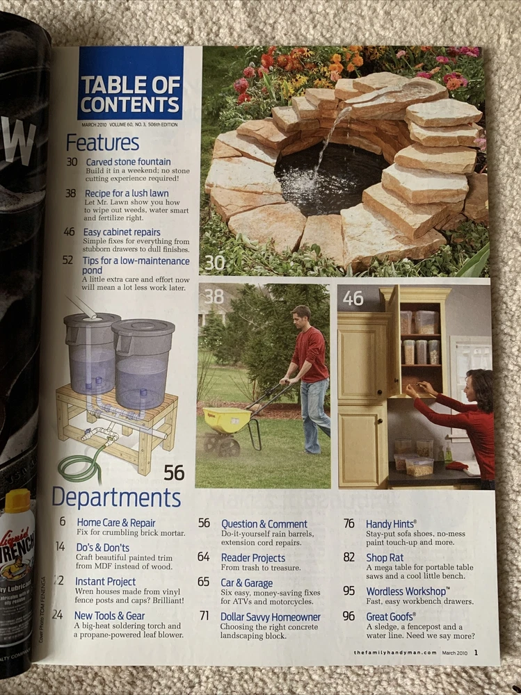 Magazine - FAMILY HANDYMAN - March 2010 - DIY - Fountain - Grass - Pond - NEW