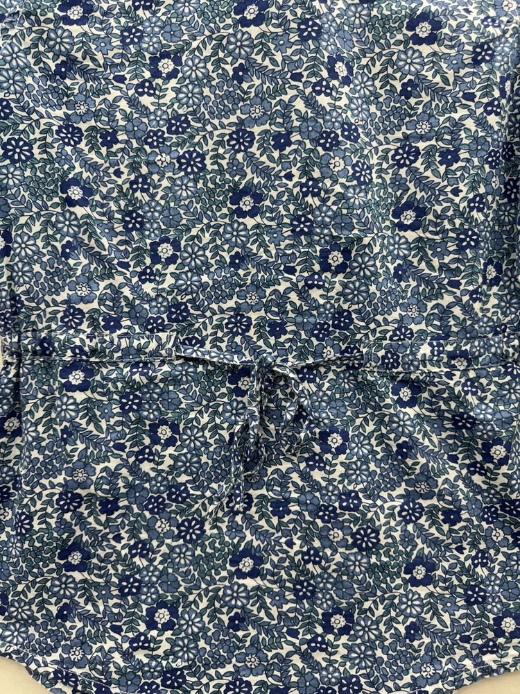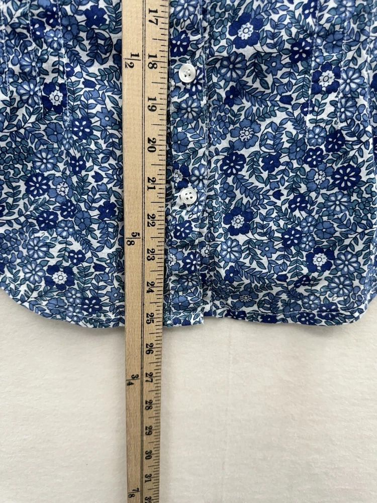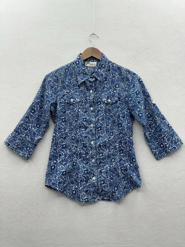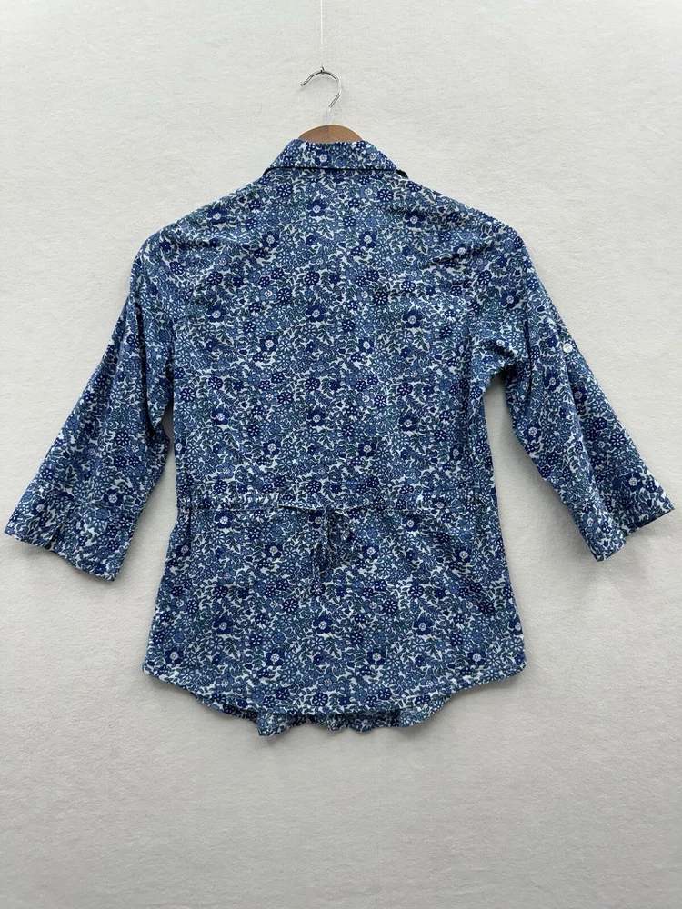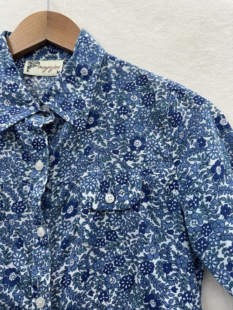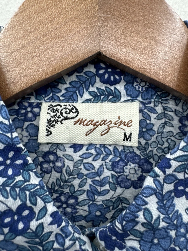 Looks as though it runs small please check measurements. Looks like a size small or possibly XS. Add a touch of floral charm to your wardrobe with this Magazine Woman's Medium Lightweight Button Up top. The blue flower pattern is perfect for any occasion, whether it's for travel, casual or business. The V-neckline and 3/4 roll tab sleeves add a stylish touch to this slim fit top, while the button closure ensures a secure fit. This top is made of lightweight cotton material, which makes it comfortable to wear during the summer, fall, or spring seasons. It's important to hand wash only to maintain its quality. The tie back feature adds an extra touch of elegance to this basic style top, making it a must-have addition to your wardrobe.