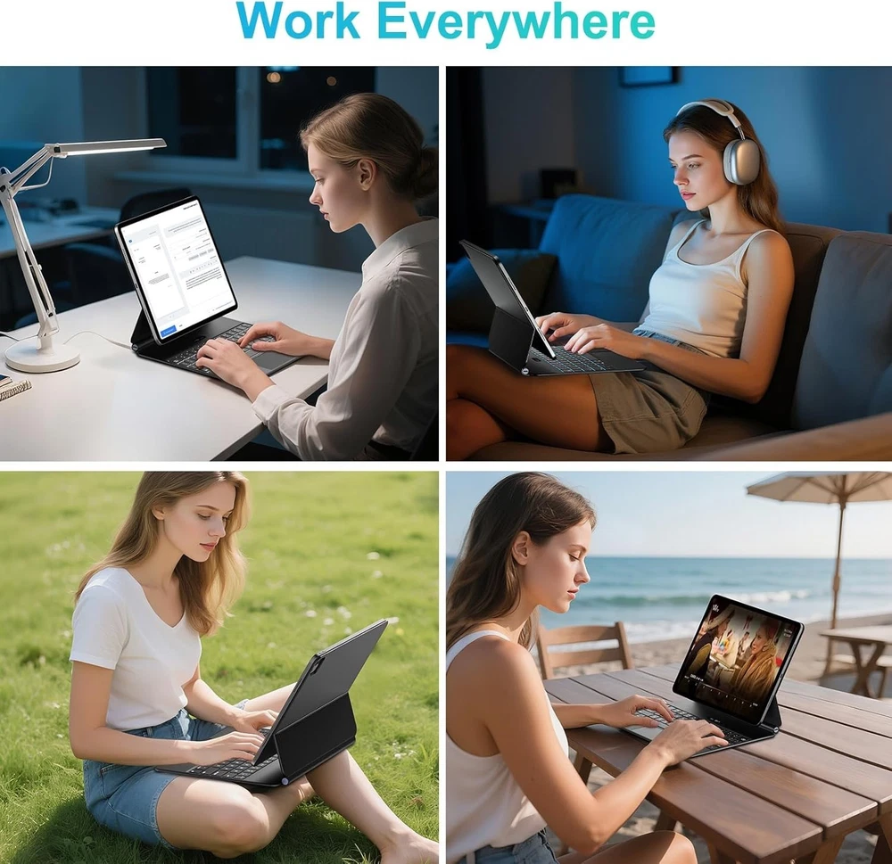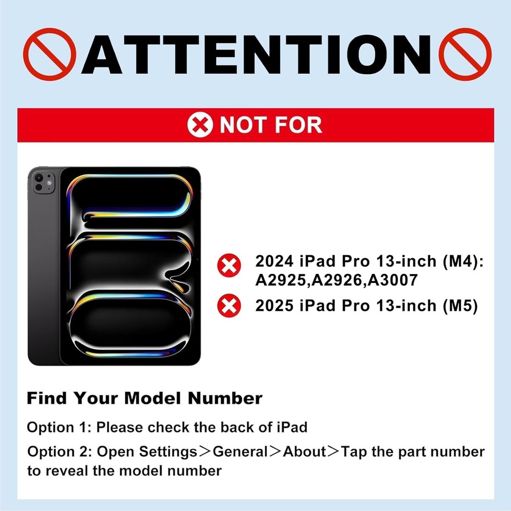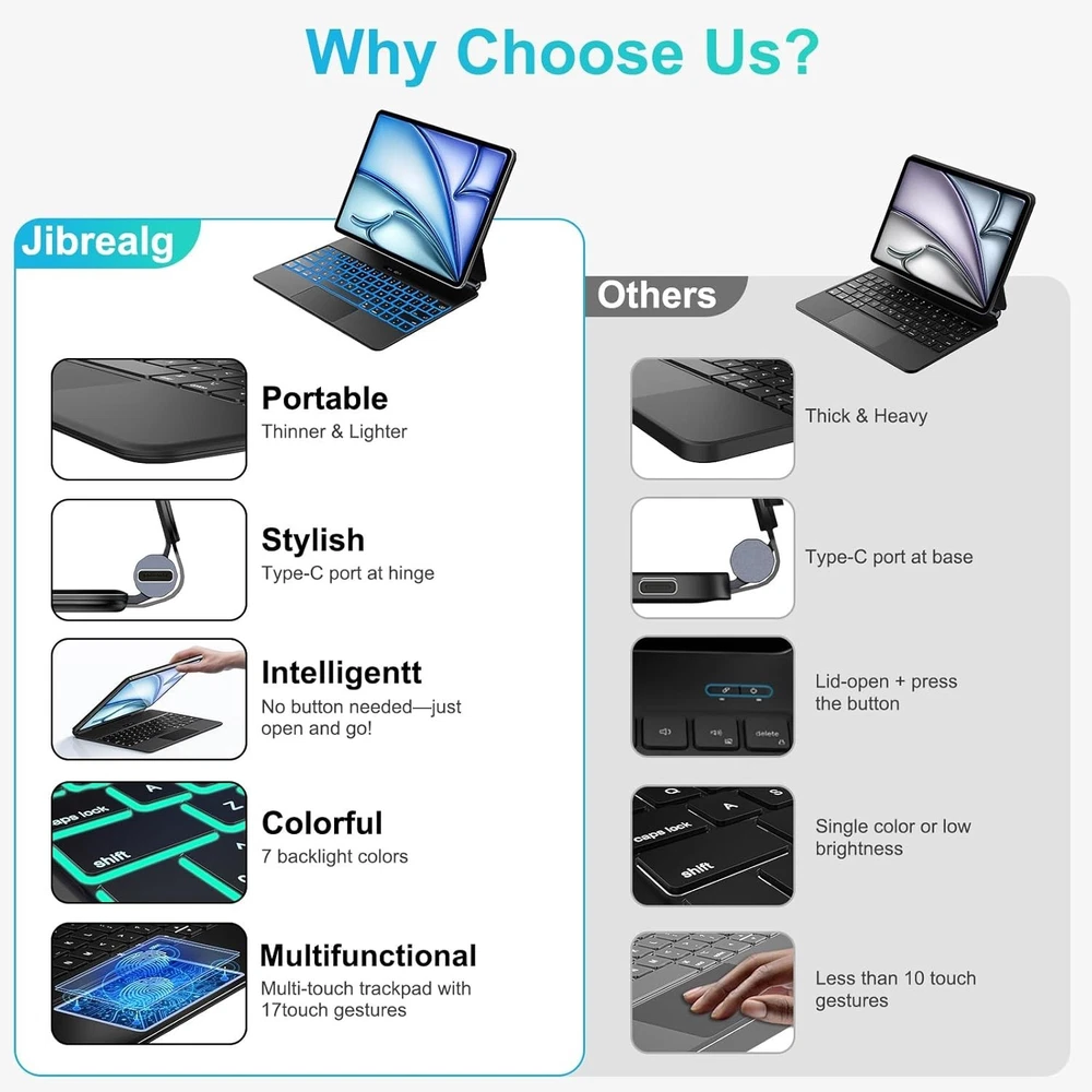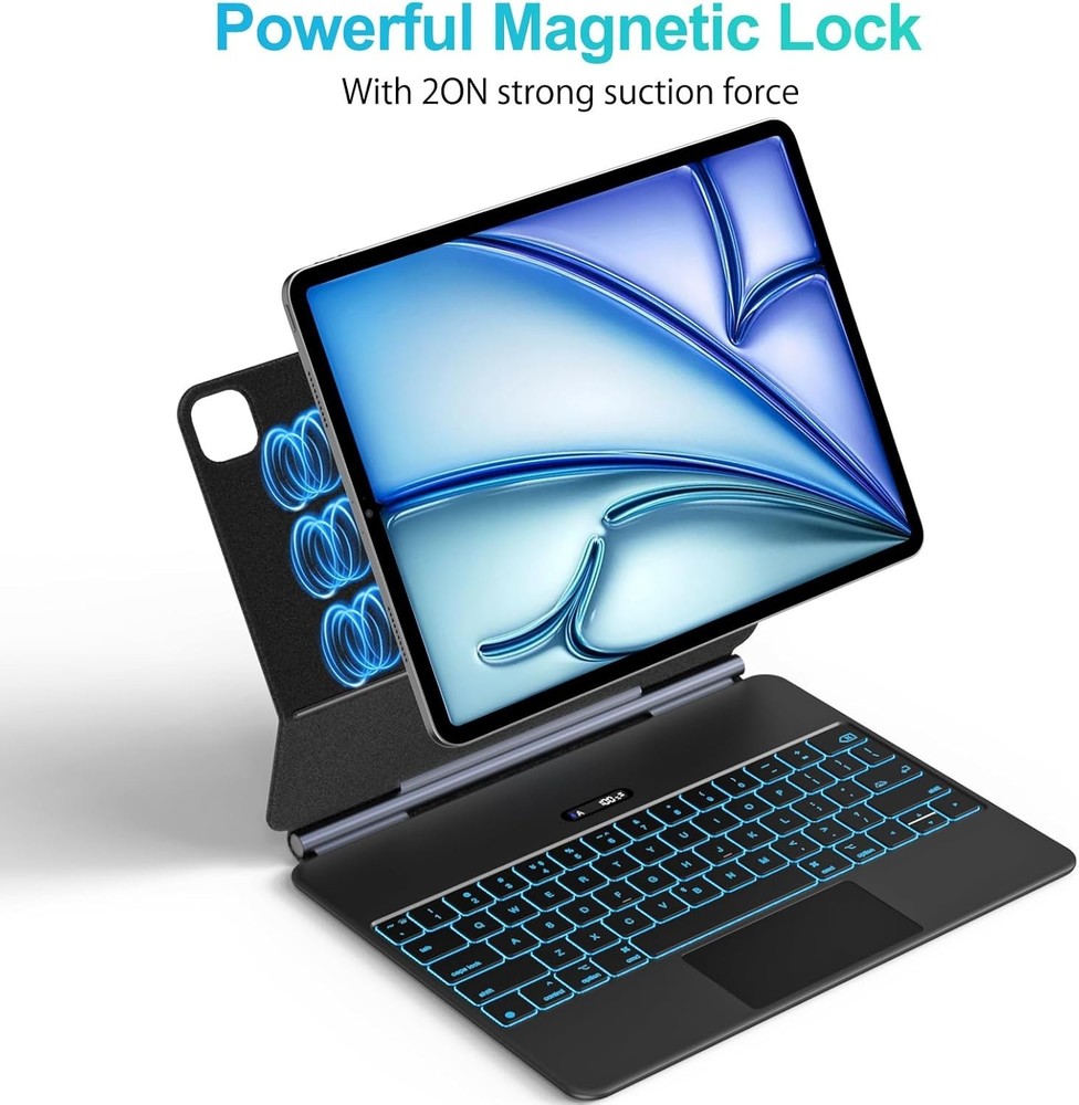 ๐๐จ๐ฆ๐ฉ๐๐ญ๐ข๐๐ฅ๐๏ผThis magic keyboard case is designed to fit the following iPad models: iPad Air 13-inch M4 2026, iPad Air 13" M3 2025(A3268, A3269, A3271), iPad Air 13" M2 2024(A2898, A2899, A2900), iPad Pro 12.9" 6th Gen 2022(A2436, A2437, A2764, A2766), iPad Pro 12.9" 5th Gen 2021(A2378, A2379, A2461, A2462), iPad Pro 12.9" 4th Gen 2020(A2229, A2069, A2232, A2233), iPad Pro 12.9" 3rd Gen 2018(A1876, A2014, A1895, A1983). Not compatible other models. If you're unsure about compatibility, feel free to contact us. We're here to help! ๐๐จ๐ฆ๐ฉ๐๐ญ๐ข๐๐ข๐ฅ๐ข๐ญ๐ฒ ๐๐จ๐ญ๐ข๐๐๏ผ๐๐จ๐ญ ๐๐จ๐ฆ๐ฉ๐๐ญ๐ข๐๐ฅ๐ ๐ฐ๐ข๐ญ๐ก ๐ข๐๐๐ ๐๐ซ๐จ ๐๐-๐ข๐ง๐๐ก (๐๐) ๐๐๐๐ / (๐๐) ๐๐๐๐ ๐๐ฅ๐ข๐ฆ & ๐๐ข๐ ๐ก๐ญ๐ฐ๐๐ข๐ ๐ก๐ญ ๐๐๐ฌ๐ข๐ ๐ง๏ผThis Keyboard Case is designed with a 0.3" slim profile, making it incredibly lightweight and easy to carry. It fits effortlessly in your bag or luggage without adding bulk. ๐-๐๐จ๐ฅ๐จ๐ซ ๐๐๐๐ค๐ฅ๐ข๐ญ ๐๐๐ฒ๐๐จ๐๐ซ๐๏ผThis Bluetooth keyboard features a 7-color backlit design with 3 adjustable brightness levels. Choose your favorite color and brightness to suit your mood ensures a comfortable and stylish typing experience. ๐๐-๐๐๐ฒ ๐๐ญ๐๐ง๐๐๐ฒ๏ผA single charge provides up to 90 days of standby time (with backlight off)โno frequent charging needed. Includes Type-C Cable for keyboard charging only, Keyboard cannot charge your iPad, iPad charges separately ๐๐ฆ๐จ๐จ๐ญ๐ก ๐๐ฒ๐ฉ๐ข๐ง๐ , ๐๐ฆ๐๐ซ๐ญ ๐๐จ๐ฎ๐๐ก๏ผType faster with agile keys and navigate effortlessly using a sensitivity trackpad. It supports 17 iPadOS gestures, offers a smooth, ready to enhance your iPad experience. ๐๐ฎ๐ญ๐จ ๐๐๐ค๐ / ๐๐ฅ๐๐๐ฉ๏ผNo buttons, no waiting. Open to get started, and close when you're done. Enjoy Laptop-like convenience with no wasted power, effortless activation. ๐๐ง๐ ๐๐ญ๐๐ง๐, ๐๐๐ง๐ฒ ๐๐ฌ๐๐ฌ๏ผThis floating stand keyboard offers multiple viewing angles, with a maximum adjustment up to 130ยฐ. Whether you're on a Zoom call or sketching ideas, whether you're at your desk, on the couch, or on the go, you can easily find the perfect angle for comfortable using your iPad.