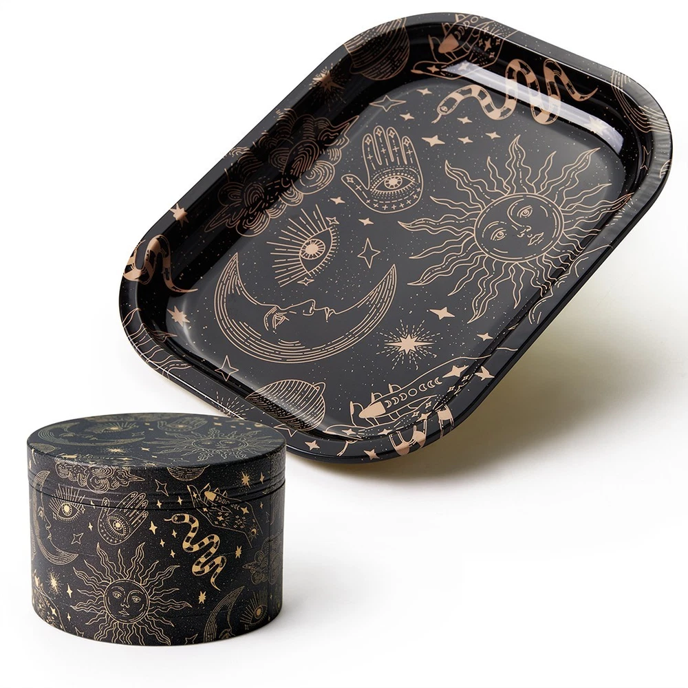 WHY CHOOSE SMOKEKOOO ROLLING TRAY AND GRINDER SET: Made of High Quality Metal and Zinc Alloy Easy to Use and Easy to Clean High Quality Print Easy to Take with You When Going Out and Attending Parties Enjoy a 30 day Money-Back return policy with FREE RETURN SHIPPING. SHOP WORRY-FREE! All Items Will Be Shipped Same Day or One Business Day After Payment Clears Quickly Shipped with UPS or USPS Ground From PA Depends on Buyer's Shipping Address ( 1-5 Bussines Day ) THE DIFFERENCE BETWEEN OURS AND OTHER SELLERS: Seamless pattern with magical elements. Set of linear vector illustrations. Celestial illustrations depicting the sun, moon, planet, clouds. design elements for decoration in a modern style. PACKAGE INCLUDED: 1 X Rolling Tray 1 X Grinder Customer 100% satisfaction is our top concern. If you have any questions, please feel free to contact us. We will do our best to solve the problem well for you Disclaimer: Must be of LEGAL AGE of your state to purchase this pipe. It is your responsibility to know, and abide, by your state laws. This Tobacco pipe is made, and intended, for TOBACCO PRODUCTS ONLY! By purchasing this item, you are agreeing that you are legally abiding by the laws in your state. Buyer is Responsible for compliance with local and federal laws pertaining to the purchase and use of this tobacco-smoking accessory.