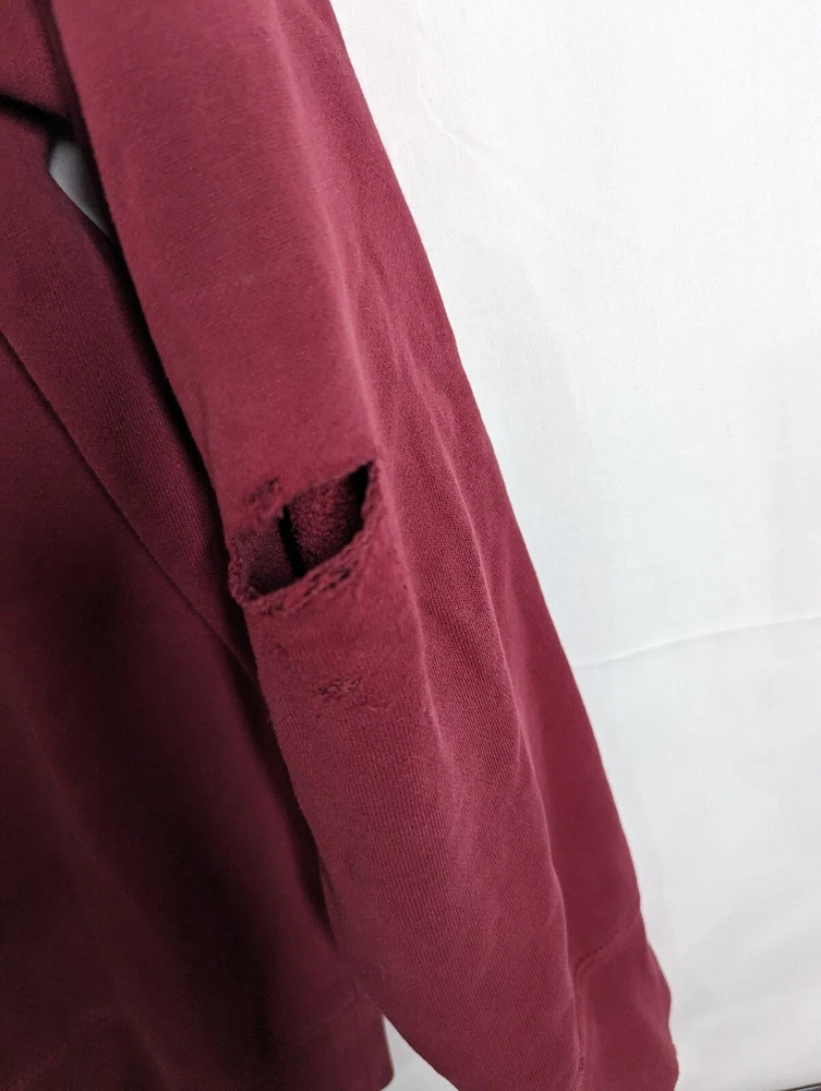 Hoodie has holes on both elbows, should be able to repair if you want to. Ships next business day.