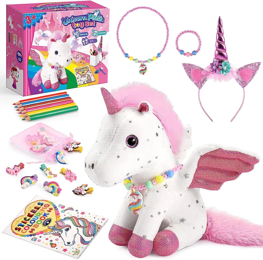 Store New Arrivals Add to Favorite View Feedback Contact Unicorns Gifts for Girls Age 3-8,Unicorn Toys for 3 4 5 6 7 8 Year Old Girls,Unicorn Stuffed Animals Kids Toys for Girls Age 3-8 Year Old,Soft Plush Girl Toys Set,Idea Girl Gifts for Birthday Xmas Description Item model number T-Unicorn Product Dimensions 6 x 3 x 9 inches Country of Origin China Item Weight 14.4 ounces Manufacturer recommended age 36 months - 12 years Manufacturer Toyze 21 IN 1 UNICORN GIFTS SET: Delight your princess with this surprise box! You'll get soft unicorn plush, cute unicorn headband,necklace & bracelet, 10 beautiful hair clips, imaginative coloring book and 6 makers. Great for unicorn lovers to play with or dress up role play DURABLE QUALITY UNICORN TOYS: Our unicorn plush are soft and well-made with skin friendly fabric, safe for young girls to cuddle and hug. The material of coloring book and unicorn ornaments also durable and reliable,easily provide hours of entertainment fun to your princess SWEET GIFTS FOR GIRLS: Comes with a delicate surprise box,our unicorns gift set are perfect for unicorn lovers.So much activities allow kids to create their own imaginative fantasy world. Awesome gift for 3 4 5 6 7 8 Year Old Girls birthdays,Christmas, or unicorn-themed parties UNICORN THEMED COLORING BOOK: Unicorns are always popular,these unicorn toys featuring fairy-tale themed book and stickers, your little artist can create the fairy-tale magical world at their own, great chance to inspire child's imagination and creativity GOOD COMPANION FOR YOUR PRINCESS: Our unicorn toys provide comfort and imaginative play, allowing your girls to practice social and emotional skills,perfect to express their creativity and personal style.Great gift for young girls Age 3-8, your daughter or granddaughter surely love it Product Description Durable Quality Unicorn Toys Our unicorn plush are soft and well-made with skin friendly fabric, safe for young girls to cuddle and hug.Great unicorn gifts for 3 4 5 6 7 8 Year Old Girls birthdays,Christmas, or unicorn-themed parties. Machine washable It can be washed directly in the washing machine without damaging the surface of the doll, which is convenient and fast,great for unicorn lovers to play with or dress up role play, your daughter or granddaughter surely love it! ABOUT US We offer the best prices around on high quality products. Our E-store includes media such as books, movies, music and games while offering electronics, toys, sporting apparel, clothing, tools, general home, garden items and more. SHIPPING We are always working hard to ensure your package arrives as soon as possible. Please understand that some factors like weather, high postal traffic, and the performance of shipping companies are outside of our control. We offer free shipping to the lower 48 states and ship within 2 business days of payment, usually sooner. We do not accept P.O. Boxes. Please provide a physical address. RETURNS We offer a 30-Day Return Policy on items which you are not completely satisfied with. You have the option for a full-refund or an exchange of the item. No returns are available on items shipped outside of the USA. PAYMENT We accept PayPal. CONTACT US This page content is yet to come Please ad us to your favorite seller and visit again later Thank You CUSTOMER SATISFACTION We try our very best to make sure every customer is completely satisfied. If there's a problem, message us! We're happy to help.