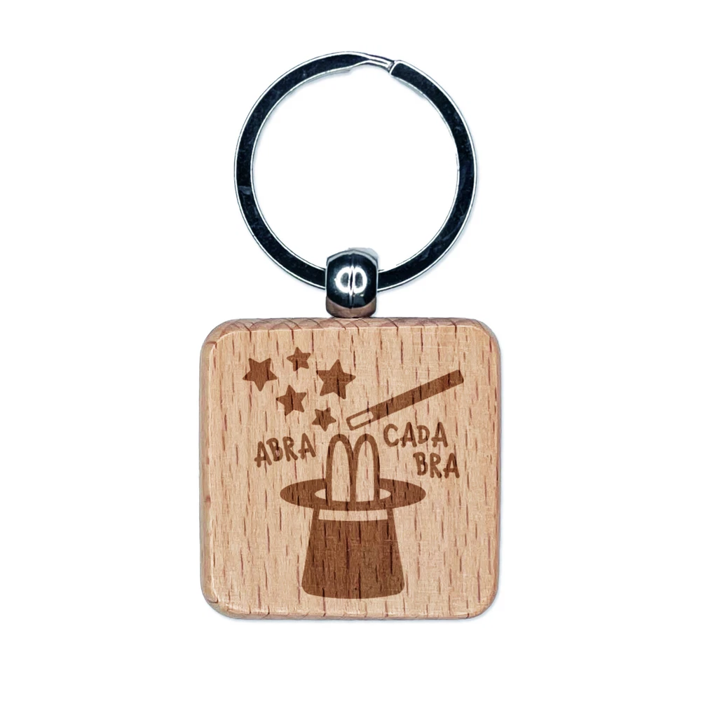 Magician Hat Magic Rabbit Engraved Wood Square Keychain Tag Charm