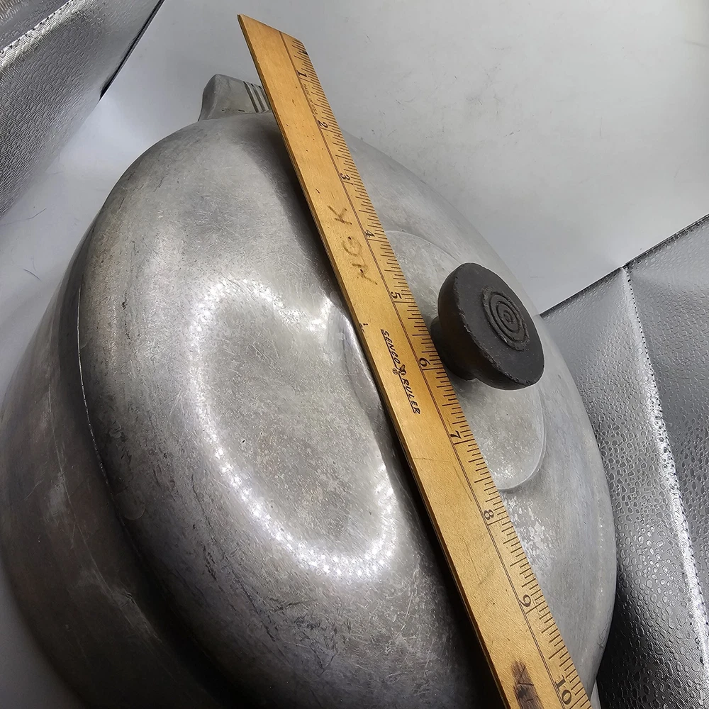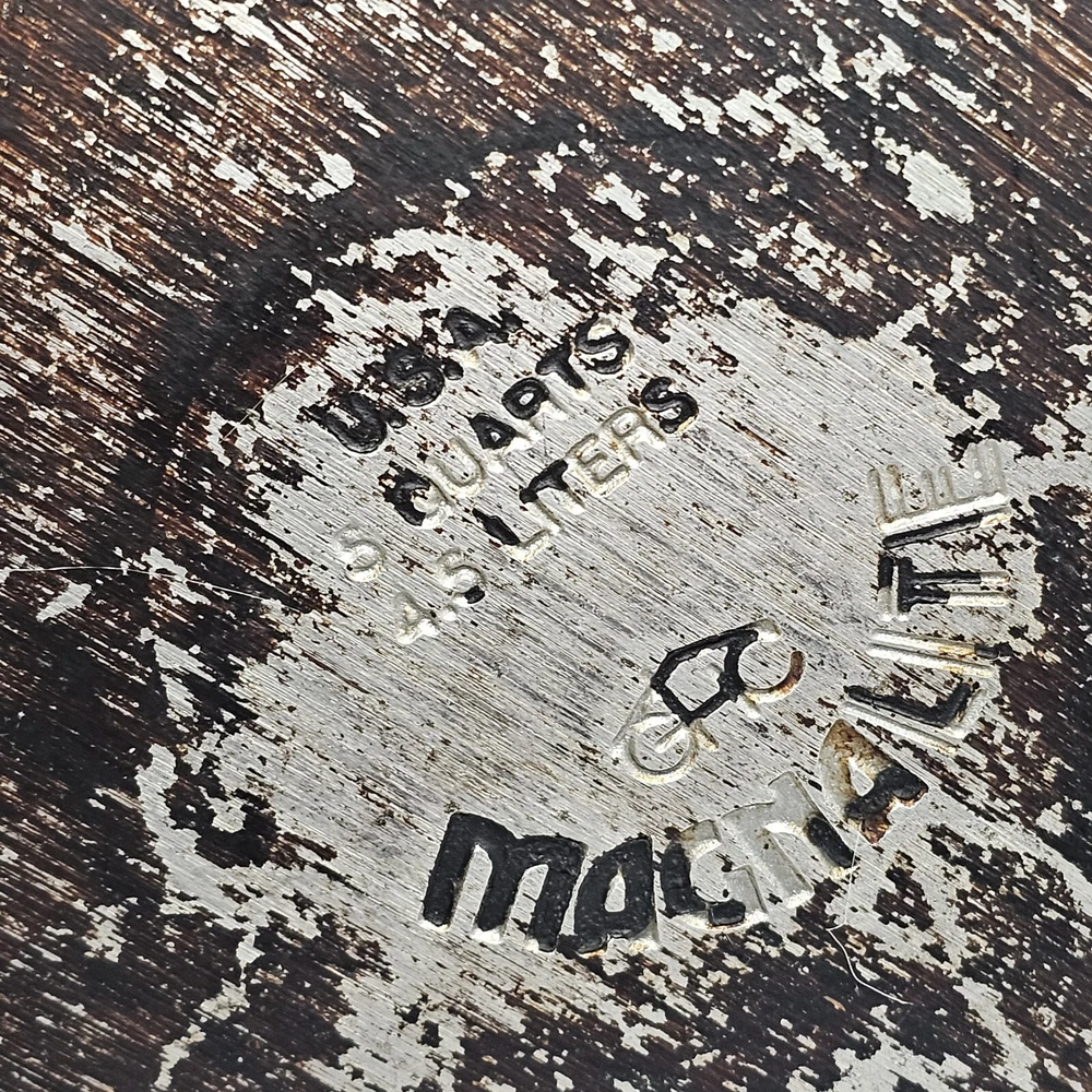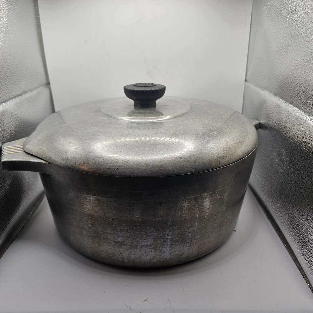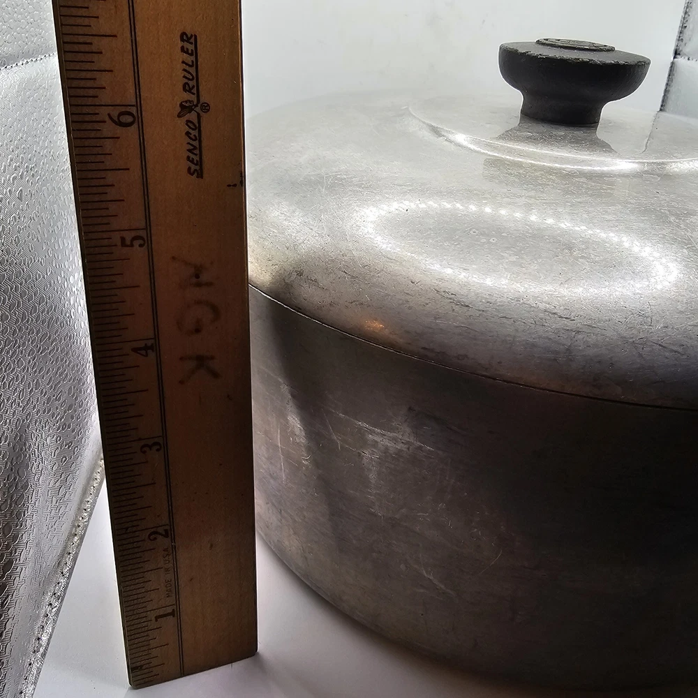 The Magnalite Classic 5 Quart Dutch Oven Stock Pot Pan is a vintage collectible piece from the 1950s, originating from the United States. This two-piece set includes a round-shaped pot made of cast aluminum in a silver color, suitable for use on both electric and gas stoves. The Dutch oven features a capacity of 5 quarts and comes with a lid and trivet insert, making it a versatile and functional addition to any kitchen. With its original design and stainless steel surface coating, this Magnalite piece exudes a retro charm that collectors and cooking enthusiasts alike will appreciate. There is staining and scratches. See photos for wear sold as is