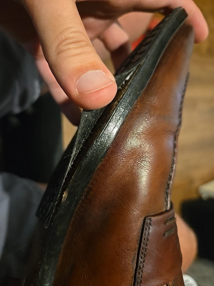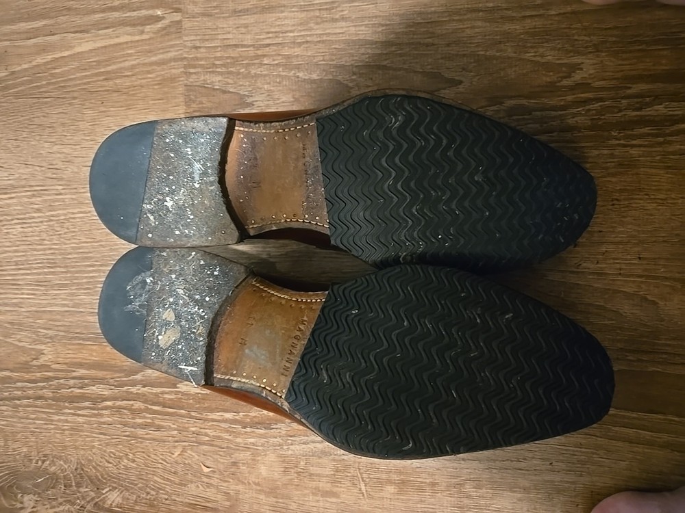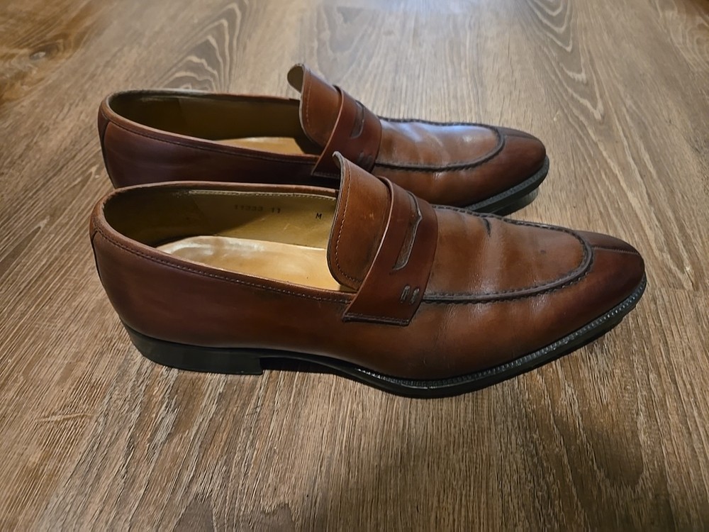 The Magnanni 11333 Men's Brown Leather Apron Toe Italian Loafers are a stylish and sophisticated choice for men looking to elevate their formal footwear. These slip-on loafers feature a classic round toe shape and are crafted from high-quality leather, providing comfort and breathability. The brown leather material with penny accents and a solid pattern make them versatile for various occasions, whether it be a wedding, going out in the city, or a special event. Made in Spain by the renowned brand Magnanni, these dress shoes combine luxury and elegance to make a statement. Bottom rubber is starting to come off a little.