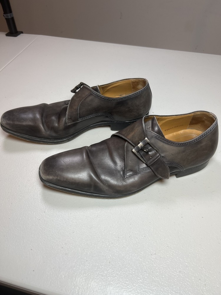 Step out in sophisticated style with these Magnanni Marco single monk strap dress shoes in a refined gray leather. Crafted in Spain, these pre-owned shoes showcase the exquisite artistry and attention to detail that Magnanni is renowned for. The single monk strap design offers a sleek and contemporary alternative to traditional lace-up styles, making them a versatile addition to any discerning wardrobe. These Magnanni Marco shoes feature a luxurious gray leather upper, providing a distinctive and elegant look. The burnished finish often seen on Magnanni's Cuero leather collection adds depth and character, ensuring these shoes stand out. Designed for comfort and lasting wear, they embody the quality and craftsmanship expected from a high-end footwear brand. Perfect for both business and formal occasions, these single monk strap shoes can elevate a suit or add polish to smart-casual attire. Their timeless design ensures they will remain a staple in your collection for years to come. Experience the blend of tradition and modern elegance with the Magnanni Marco.