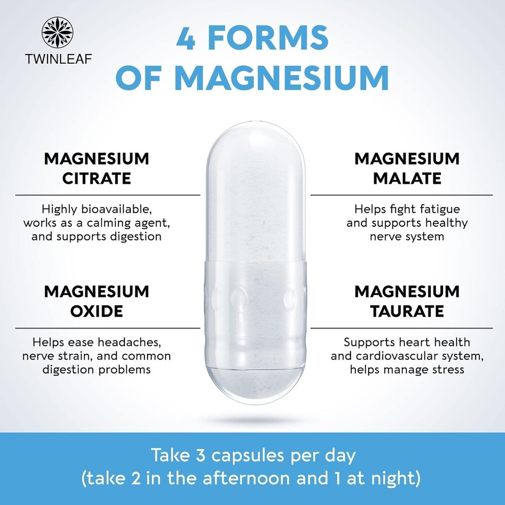 Natural Calm & Relax Aid - Magnesium-based brain boosters calm and nourish your mind making it easier to focus. Clinical studies show that your level of magnesium does have a connection to your calmness levels. Stay calm, and think better! Improved Focus & Concentration - Completely isolate your attention to the task at hand. Magnesium simply works. Why? As many as 75% of Americans are deficient in magnesium and magnesium deficiency increases with age. Brain Health & Function - Twinleaf magnesium helps move signals between your brain and body. Magnesium acts as the gatekeeper for the brain receptors, which are found on your nerve cells and aid brain development, memory, and learning. Better Rest with Magnesium Pills - Magnesium is known to promote longer, restful rest. Compare it to melatonin, which promotes faster falling asleep. Also, Magnesium supports regular heartbeat and overall cardiovascular health, which is necessary for good rest. Memory Supplement - 2000 mg complex provides nutritional support and acts as brain food for your memory. Get optimal health with high-quality, effective, affordable, and superior Magnesium formulation!