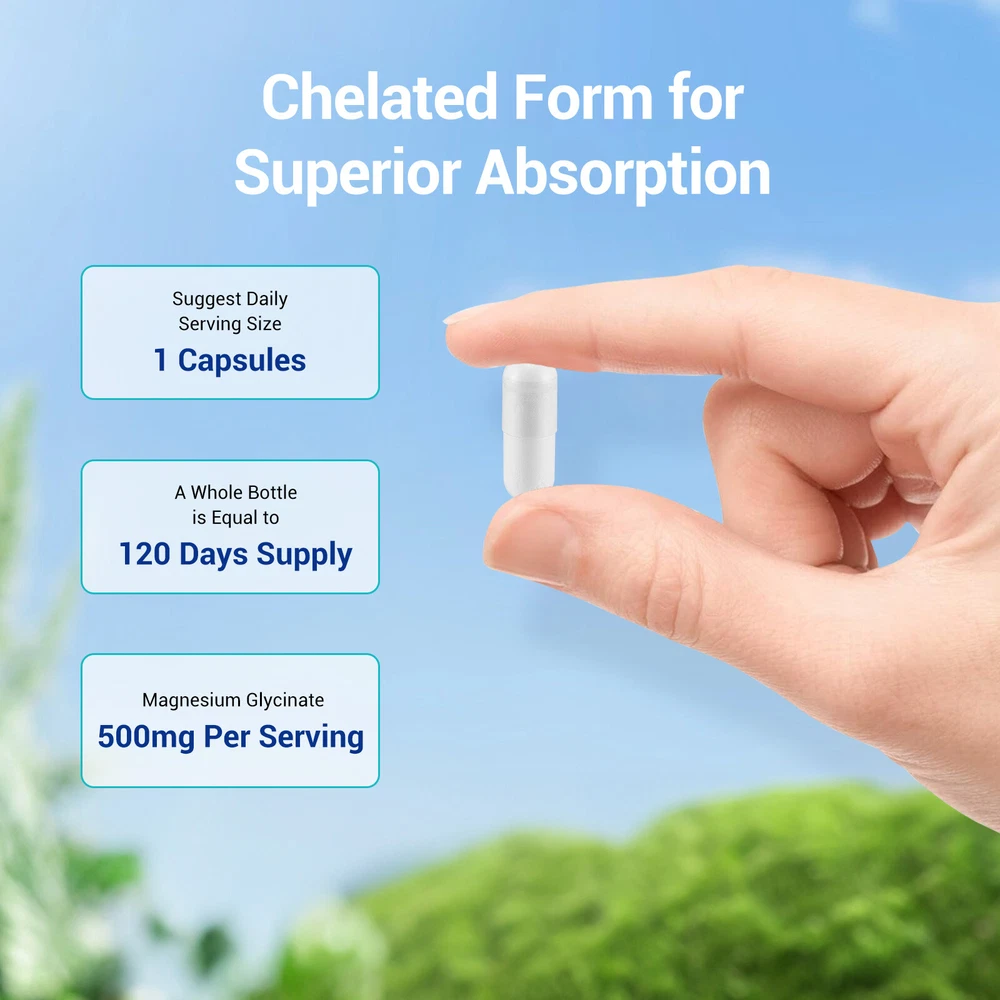 Magnesium Glycinate Supports Heart Health Nerve Function And Muscle Relaxation FEATURE: 【Easy to Absorb & Gentle on the Stomach】Different magnesium supplements have different bioavailability. Chelated magnesium glycinate, also known as magnesium bisglycinate, is one of the most gentle forms of magnesium and does not irritate the stomach and intestines. Compared to magnesium citrate or magnesium oxide, chelated magnesium glycinate has higher bioavailability and better absorption efficiency 【Calm the Body and Mind &Quality Sleep】Magnesium is involved in the functioning of over 300 enzymes in the human body. Proper supplementation of mag glycinate can help relax the mood and promote better sleep. Helps the health of bones, heart, nerves, joints, digestive system and muscles 【Easy to Swallow Capsules】Each capsule contains 500mg of magnesium glycinate (providing 90mg of elemental magnesium). Our bottle of magnesium glycinate capsules contains 120 capsules, with a recommended daily serving of 1 capsule. For better effect, you can take 2 capsules per day. They are convenient to take, easy to swallow, and provide an 8-month supply 【Quality Ingredients】Our magnesium glycinate 500mg is made from high quality domestic and foreign raw materials, non-GMO, pure ingredients, free of gluten, dairy, eggs, peanuts, soybeans, wheat, nuts, fish, shellfish and yeast. We insist on using the best raw materials to provide you with value-for-money products 【cGMP Quality Assurance】Our magnesium glycinate supplement is produced in cGMP-certified facilities in the USA. It undergoes third-party laboratory testing, and every batch of magnesium glycinate is subject to stringent quality control to ensure purity and effectiveness. We are dedicated to providing consumers with high-quality products Payment Return Warranty Shipping Contact us Payment 1. We accept payment via PayPal. Use PayPal at checkout to pay with credit or debit. 2. Immediate payment is required. Shipping will be arranged within 1 business day once payment is cleared. Return 1. We stand behind our items and offer 60 days warranty. All items are in new and working condition unless specified otherwise elsewhere in the description. 2. All Returns - defective or otherwise - MUST BE PREAUTHORIZED to guarantee refund or exchange. Please contact us to get an authorization and return address. 3. Buyer agrees to pay for the cost of re-shipment for undeliverable or wrong addresses. 4. Buyer is responsible for Return Postage as well as a 20% restocking fee if return/replacement is not a result of our mistake such as wrong item. 5. Replacement or Refund will be made upon receipt of the returned item. Please include tracking number so we can process ASAP. If you do not wish to wait for a replacement, please repurchase the item. 6. ALL REFUNDS will be processed via PayPal. Please double check via PayPal history and transaction for confirmation. PayPal will send it back to whatever you used to pay within 3-5 days. Warranty The warranty shall not apply to the following circumstances: a) Damage caused by undue ware&tear, misuse, improper installation or operation, neglect, accidents. b) Damage caused by natural disaters, flood, fire, lightning or pollution. c) If item was opened, any parts removed or repaired by any unauthorized person. Shipping FREE SAME BUSINESS DAY MONDAY- FRIDAY SHIPPING FROM USA. All orders and payments received before 4PM EST (1PM PST) will be shipped the same business day. All other orders within 1 business day. No shipping on Weekends or US Public Holidays. No responsibility for any custom duty Shipping information will be updated when available. Contact us We have always been trying to provide the best service and reliable products for every customer, however, accident may happen sometimes, please contact us to resolve any issue before leaving a negative feedback.