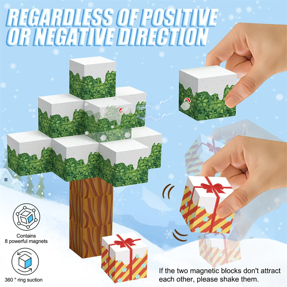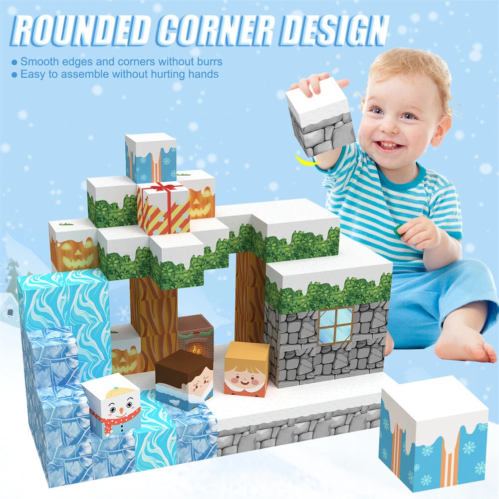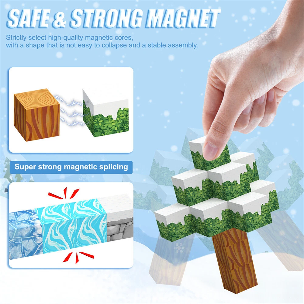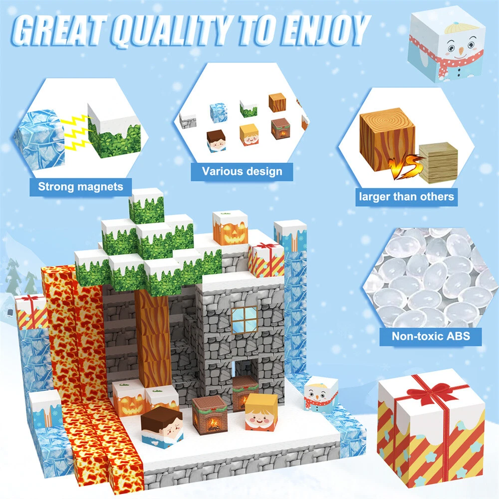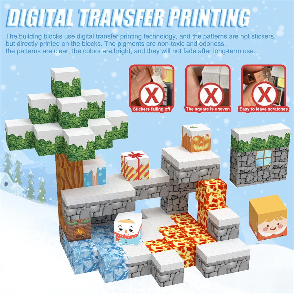 Product Description Features: - Build a Snow World Ice Cube set: Get ready to experience the fun of magnetic toys with this new magnetic cube set! Build a snow world ice cube series, add our set of character blocks, or your other toys, and start your adventure to experience the fun of role-playing and dressing up toys. Magnetic building blocks open up a fantastic world of possibilities, from simple to challenging buildings (requiring multiple sets). Let the children's imagination run wild in our magnetic open toy set - Edutainment: Building and building block toys can stimulate a variety of skills in children. Through the construction, rotation, destruction and reconstruction of magnetic blocks, it helps to improve children's creative thinking, focus and patience, cooperation, spatial and motor skills. The included creative manual guides and inspires children to explore the magnetic fantasy world. It's a fun solo activity or with friends and is a great alternative to screen time. - Extra-sensory magnetic toys for children: The 100-piece Magnetic World set combines ultraviolet technology and the science of magnetism to make your architectural art more vivid than a simple solid colored cube, offering rich patterns. More cubes, more possibilities to release children's creativity. Kids will get everything to decorate their little castle or build a snow view Ice World parking lot for their dolls to park their toy cars in - Toddler and Beginner Toy Magnetic Sets: Unlike other magnetic toys on the market, our magnetic block sets make it easier for toddlers over 1+ years old to stick the blocks together and make them strong. Round edges and the right size won't hurt small hands. The perfect STEM toy can help children gain a deeper understanding of the structural world and learn about magnetism. Recommended toy gifts for toddlers and children aged 1-12 - Excellent science gift giving idea: The fun of the magnetic cube is that it will keep kids of all ages busy for years to come. It is a fidgety children's toy perfect for classrooms, toddlers, preschoolers, teenagers 1 2 3 4 5 6 years old boys and girls. The perfect educational gift for birthdays, Christmas, Children's Day, STEM and school events. Attention: - Our initial set is 100pcs, and our main picture is divided into basic sets and advanced quantities, which vary from dozens to hundreds of building blocks, please pay attention to the scale and quantity of building, and purchase according to demand. - We put magnetic control to some challenge, develop careful observation, find building skills, and build high order patterns (watch our tutorial video). The difficulty of more than 300pcs big picture ☆☆☆☆ -☆☆☆☆☆ finally challenge it! Specifications: - Material: High quality magnet/high quality plastic - Color: as shown in the figure - Quantity: 100pcs in total - Size: The size of a single square is 2.5cm/1inch Package Included -1x 100pcs magnetic block (15 patterns) -1x Instructions