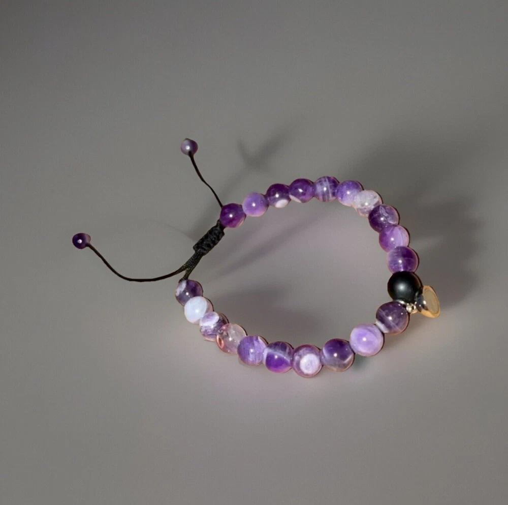 Main Stone Color: Purple Material: Gemstone Shape: Round Closure: Magnetic Charm Type: Bead Type: Bracelet Color: Multicolor Main Stone: Amethyst Brand: Amethyst Secondary Stone: Onyx Style: Beaded Main Stone Creation: Unknown Theme: Healing, Nature Main Stone Shape: Round
