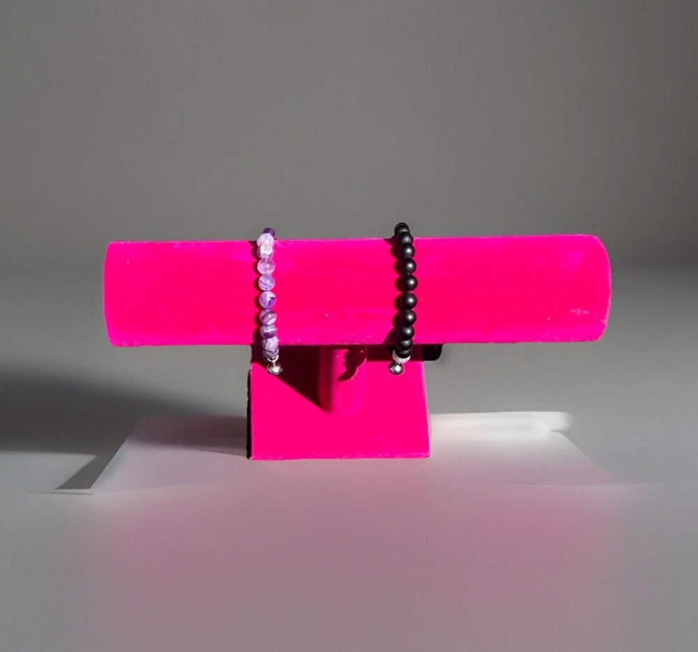 Set includes one stunning amethyst bracelet and one stylish onyx bracelet, both featuring a round gemstone with a width of 8mm. The bracelets are made of durable stainless steel and feature a magnetic closure, making them easy to put on and take off. Bracelets have adjustable rope chain which ensures a comfortable fit for all wrist sizes. New Without Tags, never worn.