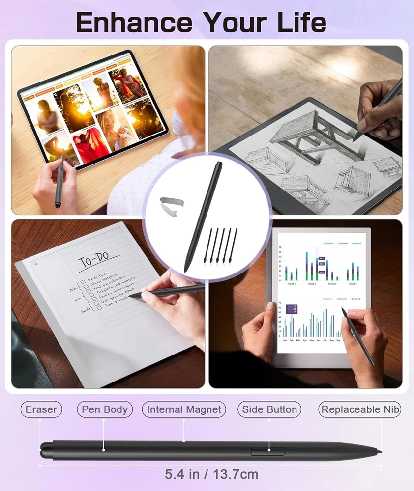 Magnetic EMR Stylus Compatible with Remarkable 2, Replacement Digital Black LuxeFusion Product Description Features 【Advanced EMR Technology】The digital EMR stylus is specially designed for devices with built-in EMR technology, such as the Remarkable 2, Kindle Scribe, and most Samsung devices (Galaxy Book, Galaxy Note, Galaxy Tab, etc.). It requires no charging, setup, or pairing—simply use it straight out of the box. Not compatible with Apple (iOS), Android, Remarkable Paper Pro, Remarkable Pro, or Windows systems. 【4096 Level Sensitivity & Tilt Support】With 4,096 levels of pressure sensitivity, our EMR stylus provides exceptional accuracy for sketches and drawings. The tablet stylus features tilt support, allowing you to angle the pen tip to create natural shadows, enhancing the vividness of your artwork on the tablet. 【Palm Rejection and Precise Writing】Our EMR pen allows you to rest your hand on the screen without disruption. You can sketch and write from all directions, ensuring that your vision is unobstructed and enhancing writing precision. The lightweight, ergonomic grip ensures comfort during extended writing or drawing sessions. 【Digital Eraser & Magnetic Design】The eraser function is conveniently located at the end of the EMR pen. For some tablets, such as Samsung, you may need to press and hold the side button to activate the eraser. The magnetic design allows you to securely attach the EMR stylus to the side of the tablet for easy storage and quick access. 【Packaging & Replacement】This package includes 1 Magnetic Stylus Pen for Remarkable 2, 1 Digital Eraser, 5 Replacement Nibs, 1 Pen Clip, 1 Instruction Manual, and 1 Packing Box. To replace the tip, simply use the pen clip for easy installation and removal. Product Details Product Dimensions: 6.69 x 2.05 x 0.47 inches Item Weight: 1.44 ounces Item model number: EMR002 Manufacturer: Ciscle Country of Origin: China Color: Black Brand: Ciscle Material: Plastic Compatible Devices: Remarkable 2 Tablet, Galaxy Tab S6/S7/S8 Item dimensions L x W x H: 6.69 x 2.05 x 0.47 inches Are Batteries Included: No Batteries Required?: No Battery Description: No battery required Free Shipping All orders ship free and fast to your doorstep. Easy Returns Satisfaction guaranteed. 30-day returns, no questions asked. 24/7 Support Contact us anytime; we’re here to help, day or night. Brought to you by LuxeFusion – Quality you can trust.