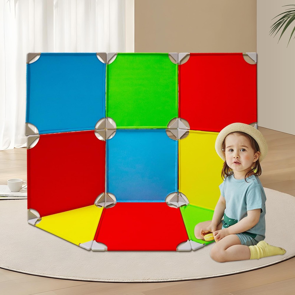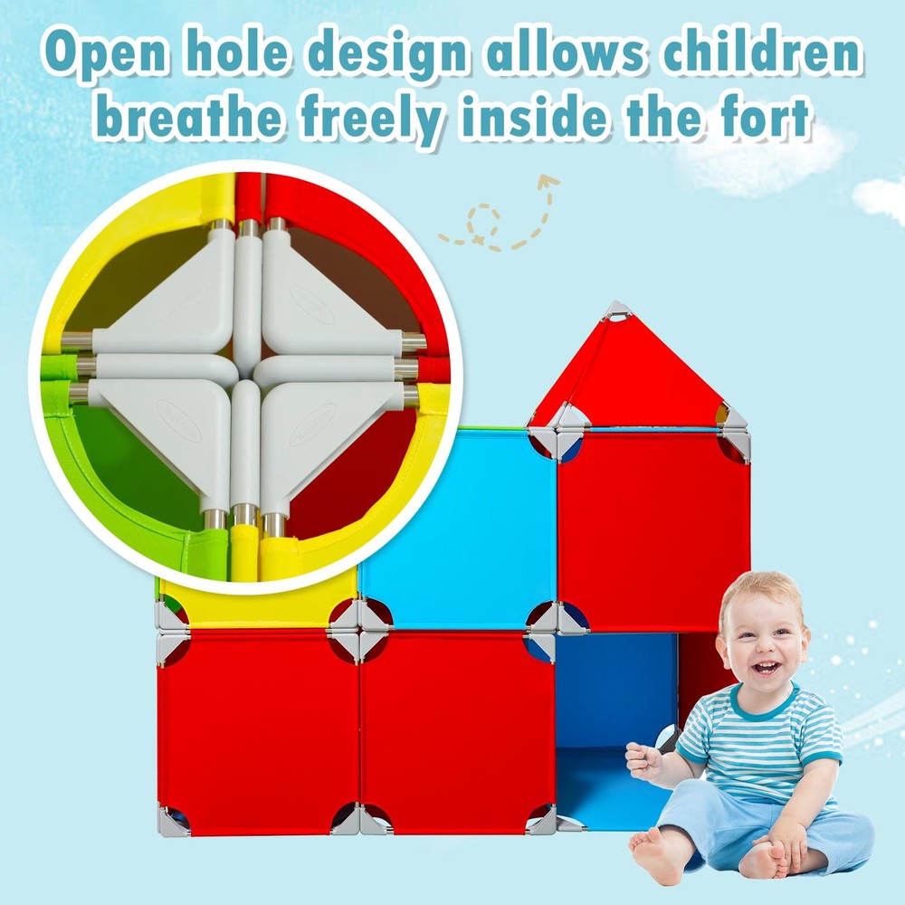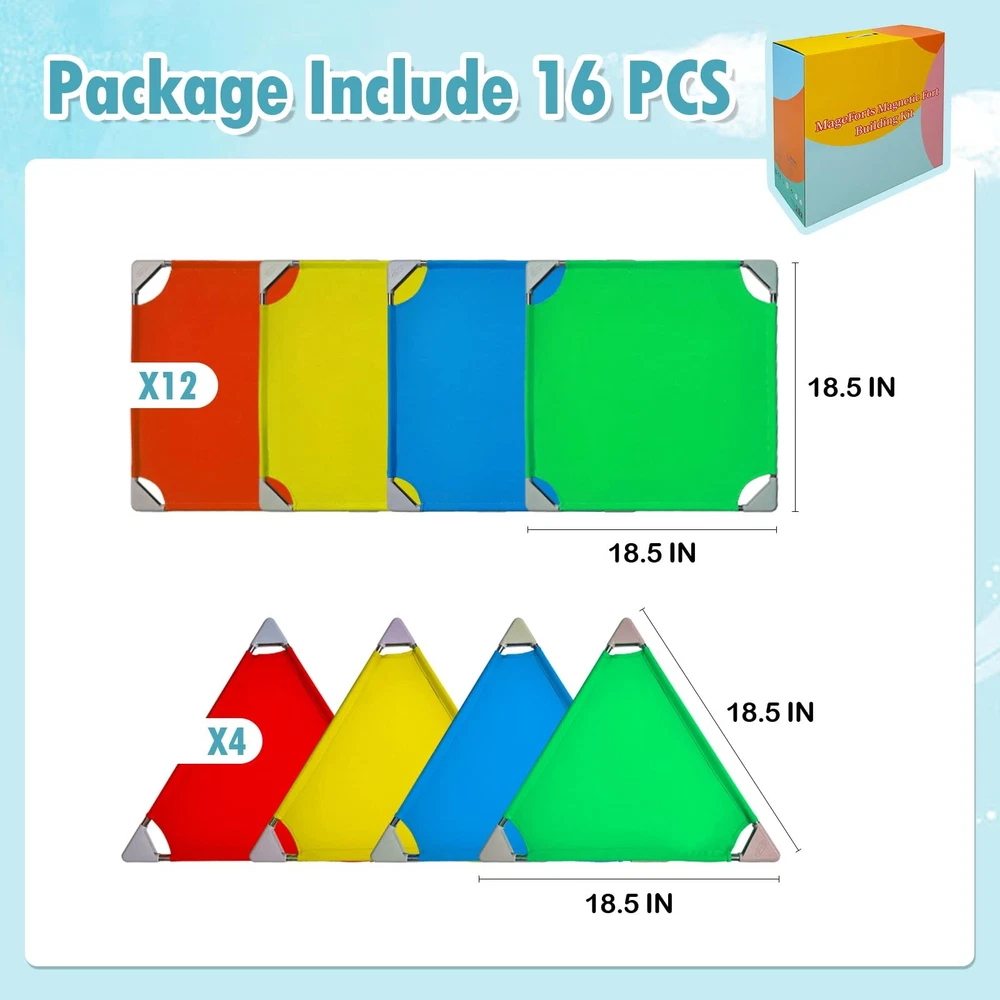 Magnetic Fort Building Panels - Giant Magnet Tiles Fort Building Kits for Kids,Colorful Lightweight DIY Magnetic Playhouse for Children with 16pcs Panels This magnetic fort-building set is crafted to spark your child's imagination. With 16 panels, kids can create everything from cozy forts and spaceships to majestic castles and rockets. Featuring an innovative auto-connect magnet system, each panel easily connects effortlessly for a smooth, frustration-free play experience. Designed for children, it requires no tools or complicated attachments—just endless creativity! Open-hole design allows children to breathe freely inside the fort, ensuring safety and comfort during playtime. The lightweight, durable structure sparks imagination and creativity, creating endless fun adventures for your little ones. Panels snap together to make a neat stack, offering easy storage and quick assembly. Designed for convenience, this feature ensures a clutter-free play area while maximizing space, making it perfect for busy families and organized fun. Colorful panels brighten up playtime with vibrant hues that captivate children's imagination. The engaging design stimulates creativity and adds a cheerful touch to any space, creating a fun and dynamic environment for endless adventures.