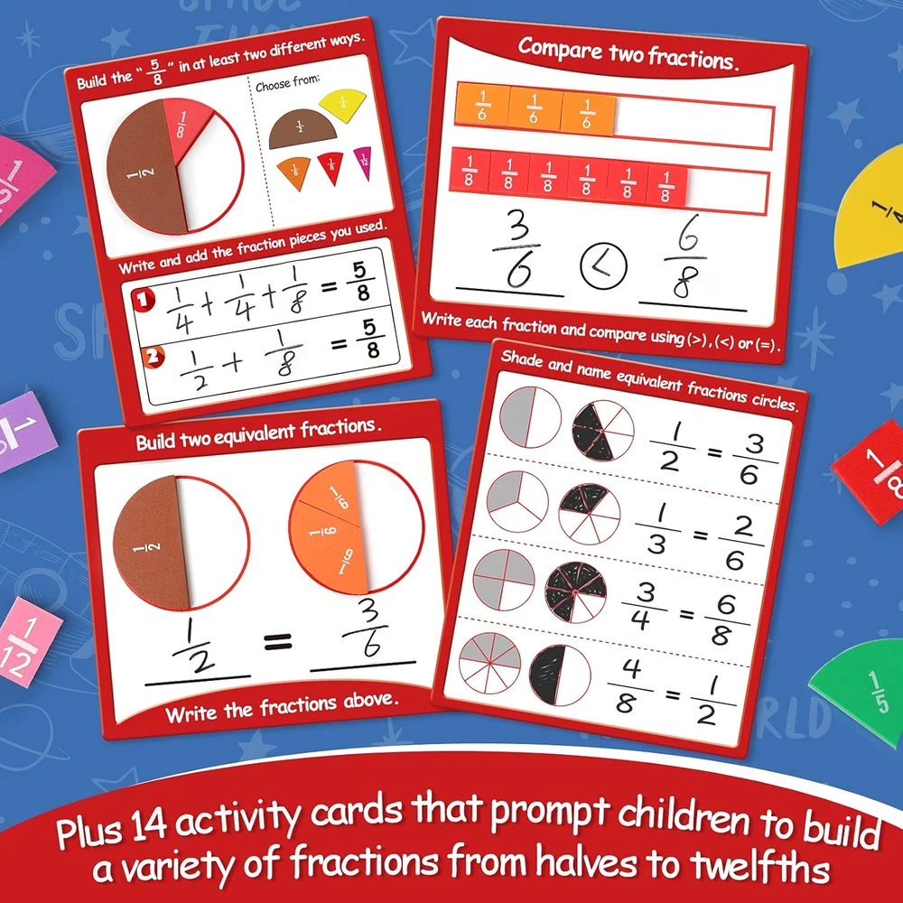 Build Math Skills: Our set is filled with engaging activities to help students master simple fractions! The fun, hands-on and interactive approach allows parents to teach with multiple modalities! Explore Equivalencies: Our set includes 102 easy-grip foam pieces representing both circle and bar fractions, plus 14 activity cards that prompt children to build a variety of fractions from halves to twelfths. Students simply combine fraction pieces to cover the shaded area of circles on the cards, then write corresponding fraction equations in the write & wipe space below. EVA Material: All place value counting blocks are made of EVA foam, flexible enough to not hurt kids’ tiny hands, water washable and fadeless. The back side adopts soft magnetic rubber, easily attached to any iron objects like refrigerator. Demonstration Ready: Rainbow segments are based with magnets, easy access for whiteboard demonstration. Bright color catches students’ attention and makes the fraction easy to be distinguished. Full circle measures 3.5" in diameter and full rectangular piece measures 9.5" in length. Master Fractions with Ease:Torlam Magnetic Fraction Tiles and Circles are a great educational toy for children, parents, teachers and educators. Perfect for learning at school or homeschooling! These fraction math manipulatives make learning fractions easy and fun for elementary (k-3) school students. Product description Proportionally-sized for easy learning Help students visualize parts of a whole and explore concepts of equivalency in a highly concrete way! Math Manipulatives Encourage children to use the manipulatives to practice fraction skills on their own! Demonstrate fraction equations Keep track of fraction values with the color-coded, rainbow circle pieces. Kids can use pieces to calculate addition and multiplication equations.