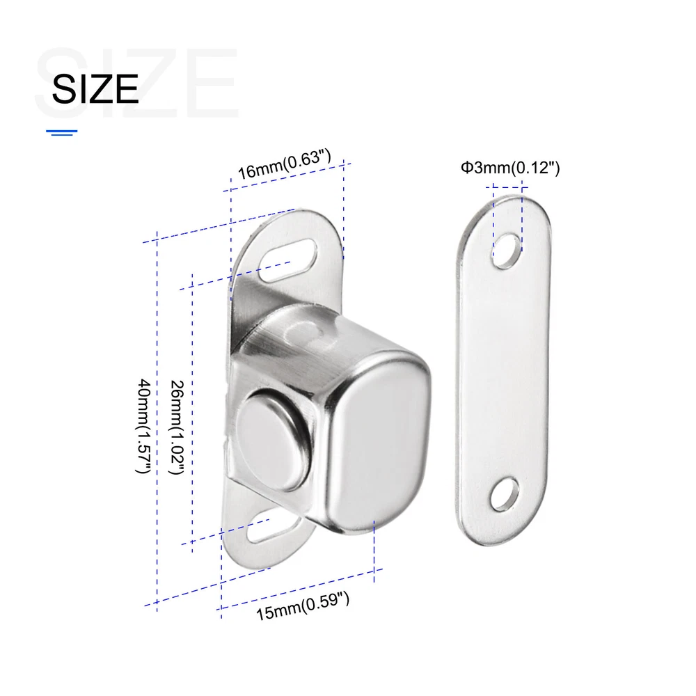 Document APPLY TO -Suitable for home furniture, glass doors, wardrobe doors, dressing tables, cupboards, wardrobes, closets, etc,Specification:Main Body Size: 40mm(L)x16mm(W)x15mm(H)/1.57"x0.63"x0.59"Metal Plate Mounting Hole Diameter: 3mm/0.12"QUANTITY INCLUDED - 1Pcs x 40mm/1.57" Magnetic CatchADVANTAGE - Our magnetic door catch design is small, drawer closet magnet latch can close the door more efficiently. The magnetic force makes it difficult for your pet to open the door so that add extra safe to your home. Magnetic Latches Catch (40mm/1.57") 1Pcs, Stainless Steel Cabinet Magnet Latch APPLY TO -Suitable for home furniture, glass doors, wardrobe doors, dressing tables, cupboards, wardrobes, closets, etc, Specification: Main Body Size: 40mm(L)x16mm(W)x15mm(H)/1.57"x0.63"x0.59" Metal Plate Mounting Hole Diameter: 3mm/0.12" QUANTITY INCLUDED - 1Pcs x 40mm/1.57" Magnetic Catch ADVANTAGE - Our magnetic door catch design is small, drawer closet magnet latch can close the door more efficiently. The magnetic force makes it difficult for your pet to open the door so that add extra safe to your home. Hot Item Payment 1.We accept eBay payment . 2.Payment must be received within 7 business days of auction closing. Shipping 1.We ship to your eBay or Paypal address. Please make sure your eBay and Paypal address is correct before you pay. 2.Items will be shipped within 1-3 business day when we received payment. 3.Delivery time depends on destination and other factors. Description Policy Magnetic Latches Catch (40mm/1.57") 1Pcs, Stainless Steel Cabinet Magnet Latch APPLY TO -Suitable for home furniture, glass doors, wardrobe doors, dressing tables, cupboards, wardrobes, closets, etc, Specification: Main Body Size: 40mm(L)x16mm(W)x15mm(H)/1.57"x0.63"x0.59" Metal Plate Mounting Hole Diameter: 3mm/0.12" QUANTITY INCLUDED - 1Pcs x 40mm/1.57" Magnetic Catch ADVANTAGE - Our magnetic door catch design is small, drawer closet magnet latch can close the door more efficiently. The magnetic force makes it difficult for your pet to open the door so that add extra safe to your home. Hot Item Payment 1.We accept eBay payment . 2.Payment must be received within 7 business days of auction closing. Shipping 1.We ship to your eBay or Paypal address. Please make sure your eBay and Paypal address is correct before you pay. 2.Items will be shipped within 1-3 business day when we received payment. 3.Delivery time depends on destination and other factors.
