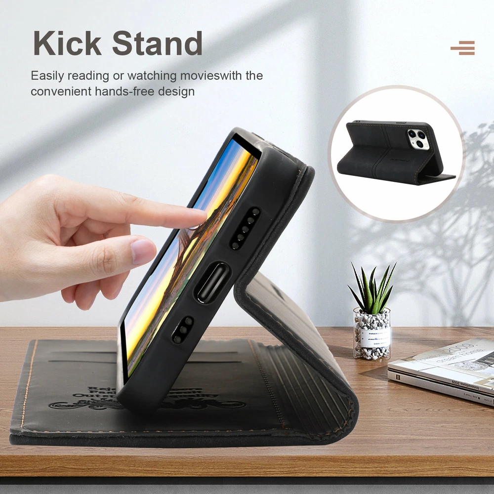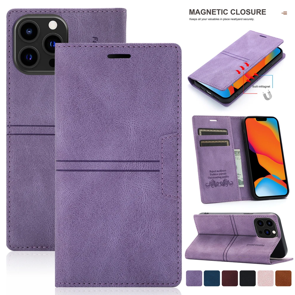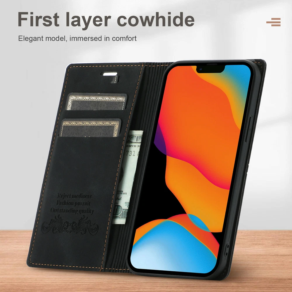 Magnetic Clasps Designed Leather Folio Wallet Case Flip Stand Card Holder Pocket Shockproof Phone Cover For New Apple iPhone 15 14 13 Pro Max 2021 12 Mini 11 Pro Note: Without Screen Protector Film, Please check your Correct Model !!! ( Any question about our items, please contact us firstly, we will reply within 24 hours, and give you the best solution, thanks in advance. ^_^ ) Features: - GENUINE LEATHER & FULL PROTECTION - 1. This leather cases are precision made of top layer cowhide leather. These hides are selected for quality, strength, character and grain. 2. Durable soft TPU full-body inner case comes with cushioned shockproof edge and ensures your phone against drops and bumps. Provides great dual-layer protection for your smart phone. - FOLIO CASE WITH CARD HOLDER - Wallet case design, you can hold 3 credit cards and some cash without any struggles. It is convenient to carry license/cards along with some cash everywhere you go. - MAGNETIC CLOSURE AND STANDING VIEW- The built-in magnet will ensure that the front part of the case doesn't open and protect your phone from dropping accidentally. (Magnetic not strong, no card will be better.) Kickstand function design, you can stand your phone in desk or landscape model without phone holder. - FULL-AROUND PROTECTON FOR PHONE- Inner shell material is made of soft TPU, providing all-around protection. Raised edges on the case back to protect the camera. Pay attention, inner shell can't be detached from the outer leather case. - CONVENIENT TO USE - 1. Hidden magnetic closure keeps all your valuables in place neatly and securely. 2. Invisible kickstand can be switched to a horizontal position and acted as a firm stand. 3. Precise cutouts for speaker, camera, flash and other functional ports, allow access to all ports and functions easily, without removing the case. 4. Carry-all design is suitable for everyday life and business trip Package Included: 1 * Magnetic Leather Wallet Case