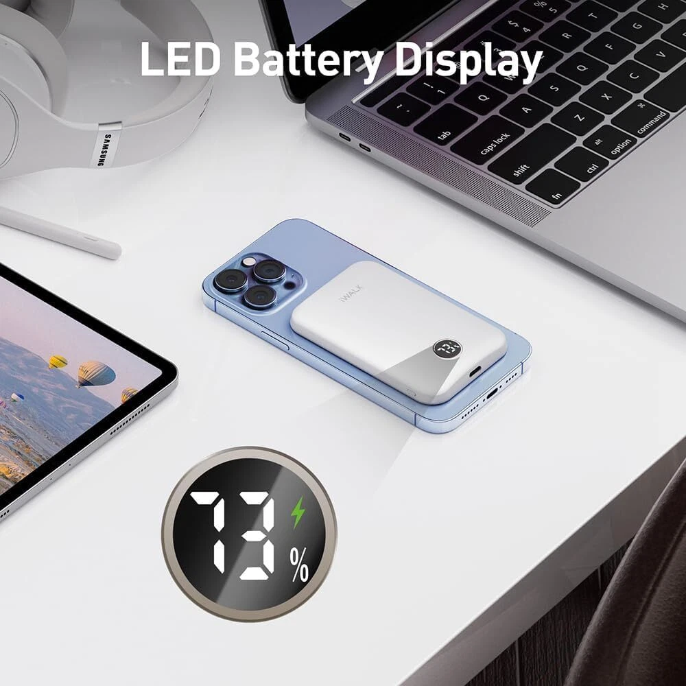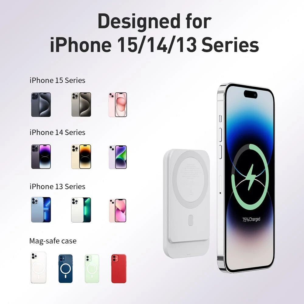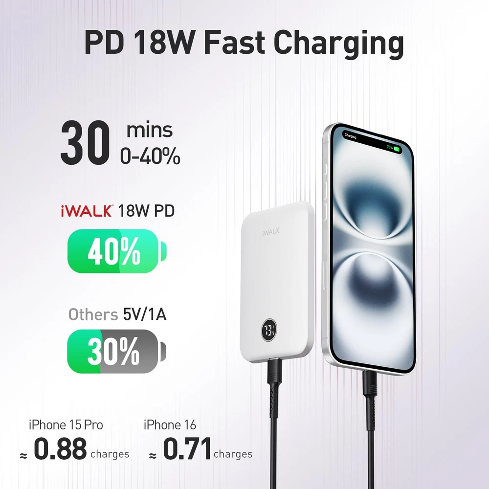 Comfortable Grip: Ergonomically designed for easy handling,the ergonomic palm area design allows your palm to make better touch with power bank. Ultra Slim: wireless portable charger has a thickness of 0.5inch, and it weighs 0.26 pounds, perfect size is ideal for you to carry, convenient for your traveling, working, etc. PD 18W Input & Output: Supports PD 18W input and output, with PD input, it can be fully charged within 2.5 hours. PD output provides faster charging speed than others. Smart LED Display: Intuitive digital LED display screen that accurately reflects the remaining power of the power bank, make the power management visible. Compatibility: This portable charger is special designed for iPhone 16/15/14/13/12 series without a case, or in a magnetic case. And you can also charging other device via a cable, comes with an USB-C TO USB-C cable .