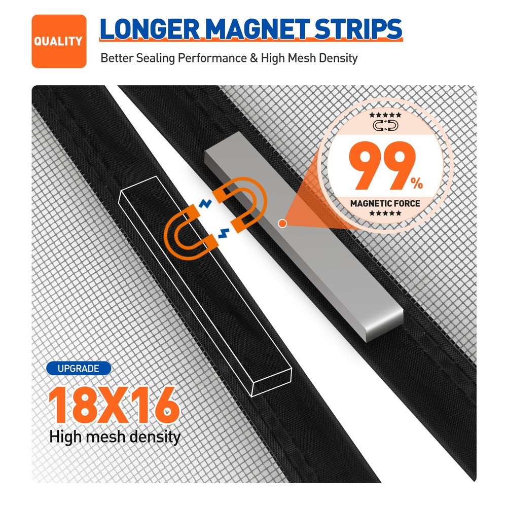 This Fiberglass mesh is the main material for making invisible door screen. Good light transmittance, is one of the most commonly used high-end door screen series. On the market called [Fireproof mesh], because it is the material of glass fiber flame retardant material, and with a colloidal coating. Has a slight odor, not easy to break, and not leave a crease, can be burned in fire, burning part is the colloidal coating, glass fiber will not burn. Mainly used to prevent cigarette butts. After the experiment, the cigarette stays in the fiberglass screen door 3-5 seconds will not have holes and other damageFiberglass 2. Super sturdy and durable fiberglass mesh, no breaks. 3. Super strong attraction magnets construction with extra hook and loop hasp, no gaps. 4. Strong reinforced hook and loop with the full frame, avoid falling. 5. Big enough for sliding door, double door, screen door hardware 6. Lifetime replacement guarantee. Package Include 1. A fiberglass screen door 2. A roll of hook and loop 3. A pack of push pins SCREEN DOOR SIZE - Actual Screen size: 34 x 83 inch, Fit door size: 32 x 82 inch. Please measure your door size (excluding the door frame) before ordering. UPGRADED REINFORCED MAGNET - Screen door mesh is equipped with 99% stronger magnets sewn into the seams, offering easy hands-free opening and quiet, automatic closing. EXCLUSIVE WINDPROOF FASTENER - Door screen magnetic closure, with its specially designed hasp in the middle, helps ensure it is not easily blown open on windy days. FULL FRAME HOOK AND LOOP - The door curtain has a full-frame hook&loop strip to keep the curtain stable and in place. It's discreet, easy to install and remove and perfect for areas that need frequent cleaning. STURDY FIBREGLASS MATERIAL - The sliding screen door curtains is made from fiberglass, which is better than other meshes.It also offers outstanding durability, windproof and high tensile strength. EASY INSTALLATION - Just use the included hook&loop tape to attach door screen to the door frame by watching video. Extra push pins provide added sturdiness. PET AND KID-FRIENDLY - Magnetic screen door mesh has an 18*16 mesh, letting fresh air in while blocking critters. It's durable, tear-resistant, and perfect for homes with pets and kids, offering easy access for both while being scratch-proof. INCLUDED - This door net screen with magnet comes with hook tape, drawing pins, and an instruction manual. Two-pack comes with a packaging box.