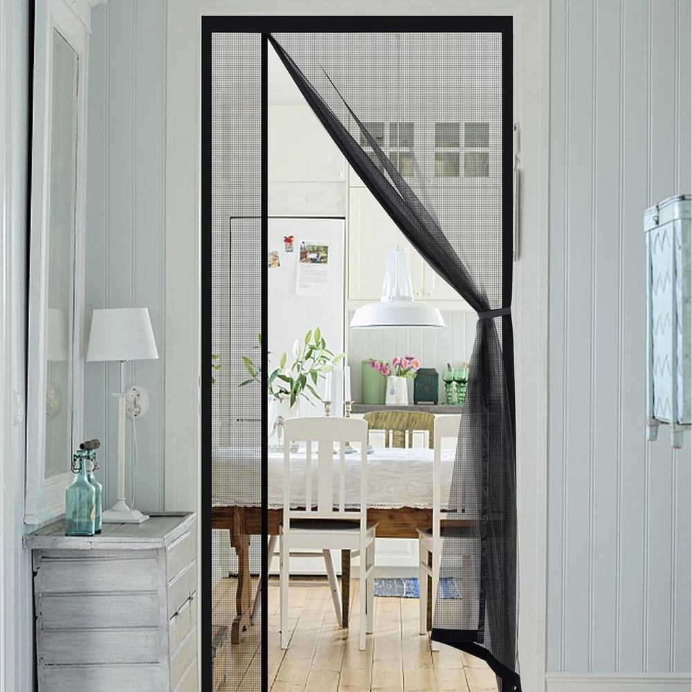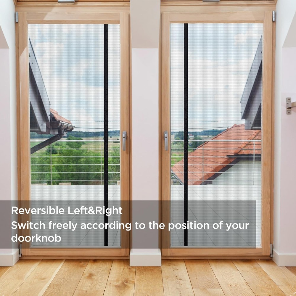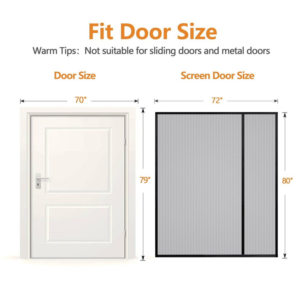 72x80 Magnetic Screen Door Fit Door Size 70x79 Left and Right Opening: The top and both sides of the magnetic screen door is designed with felt fabric and both sides can be used with Velcro, so the curtain can be freely switched according to the position of the door handle. Full frame widen adhesive tap strip to 1.5 inch, make sure maximum stability for longer use. Screen Door Size: Magnetic door screen size 72x80 inch, fits door size up to 70x79 inch. The screen can be replaced for a fixed screen door, including interior or exterior, entry, patio, deck, porch, balcony, glass, and more. Premium Quality Fiberglass Mesh: Compared to nylon screen doors mesh, fiberglass material has heat, fire, aging resistance and good light transmission and long service life. You can bring fresh air in to your home everyday, and still keep bugs out! Hands-free: The screen door has many strong magnets, with 2 of gravity blocks at the bottom, which can be closed quickly and quietly, so you no longer have to turn around to close the door. Unique Design: The package contains a screen mesh, a box of nails, a roll of Velcro and a drawstring. The drawstring is no longer sewn to the magnetic, allowing you to adjust the position of the drawstring where you need it. Let Fresh Ari In: The density of magnetic screen door is 18x18 mesh, which can well ensure breathability and light permeability, so that it can create the perfect environment for your home. Enjoy that fresh air, breeze, and sunshine!