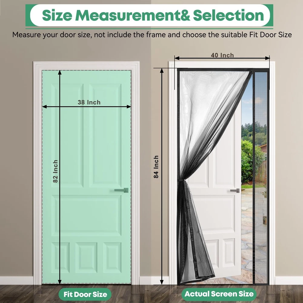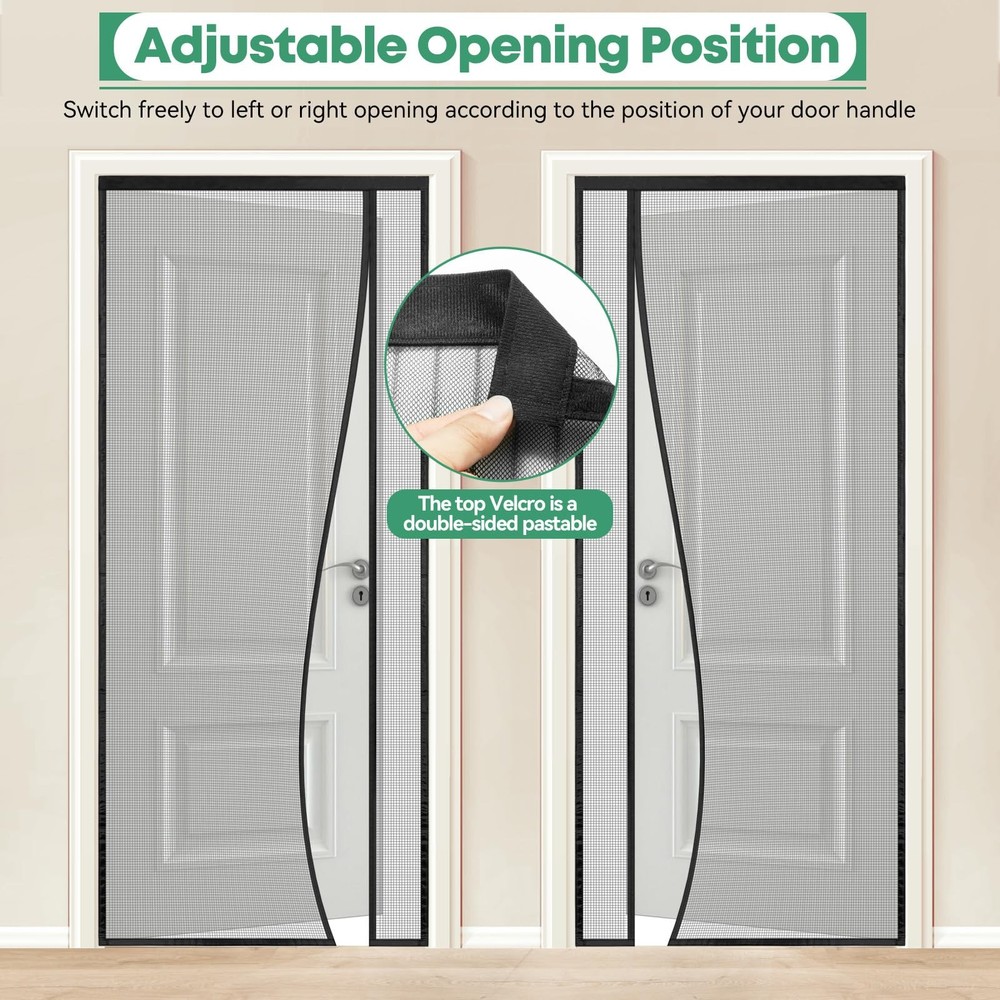 【Innovative Side Opening Design】 Unlike traditional center-split doors, our magnetic screen door features left/right side openings for flexible placement around door handles or furniture. Enjoy unobstructed views and effortless access, adapting seamlessly to your space layout with adjustable hook-and-loop tape 【Premium Durable Construction】 Upgraded with tear-resistant mesh and heatproof adhesive velcro for long-lasting use. Magnets are quietly cloth-wrapped to ensure noise-free closure, perfect for homes with kids, pets, or frequent use 【1-Minute Drill-Free Installation】 No tools, no damage! Install or remove in seconds using strong adhesive strips. Ideal for renters and all door types. Auto-closing design keeps bugs out while letting pets/kids pass freely 【Perfect Fit for Standard Doors】 40"W x 84"H screen with extended velcro edges fits doors up to 38"W x 82"H. The left and right side velcro is 1 inch wide, and the top velcro is 1.5 inches wide. Package includes screen, bonus velcro roll, push pins, and visual guide 【Smart & Pet-Friendly Functionality】 The strong magnetic seal snaps shut instantly, blocking insects yet allowing easy entry. Lightweight mesh ensures smooth operation, designed for high-traffic households