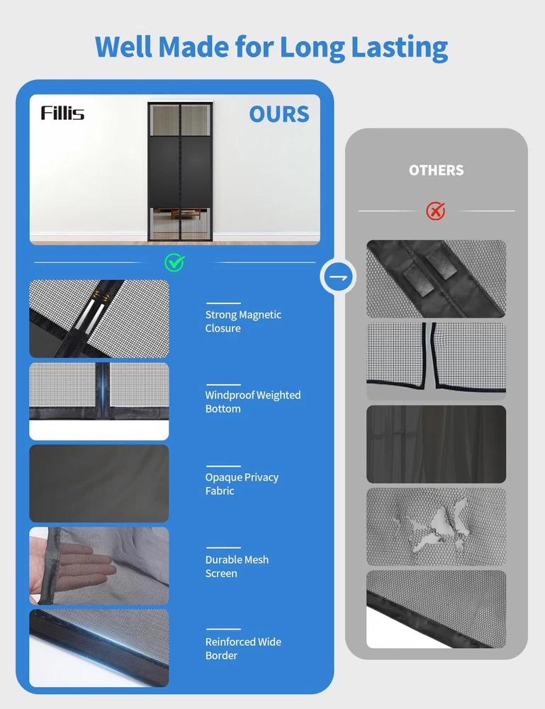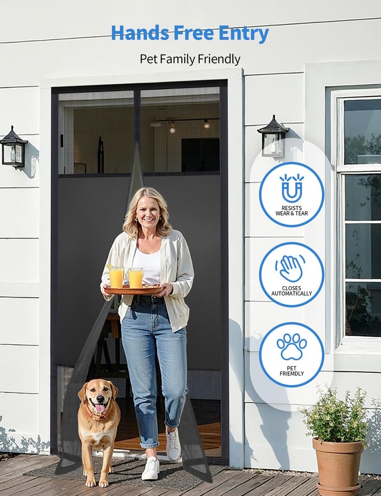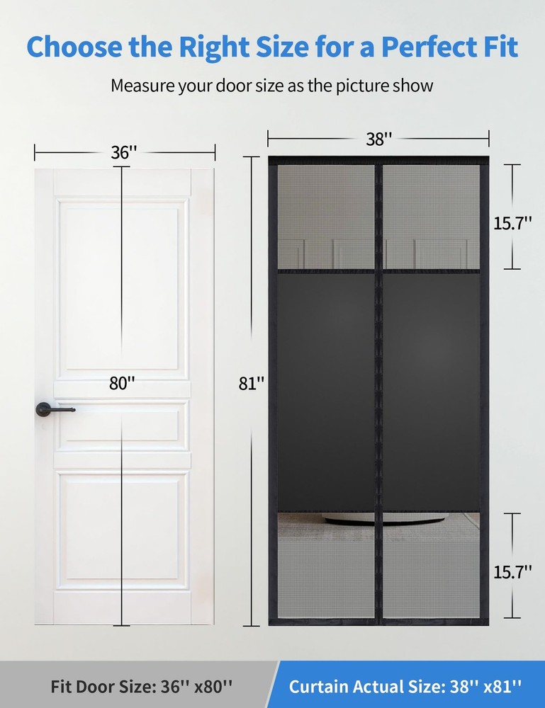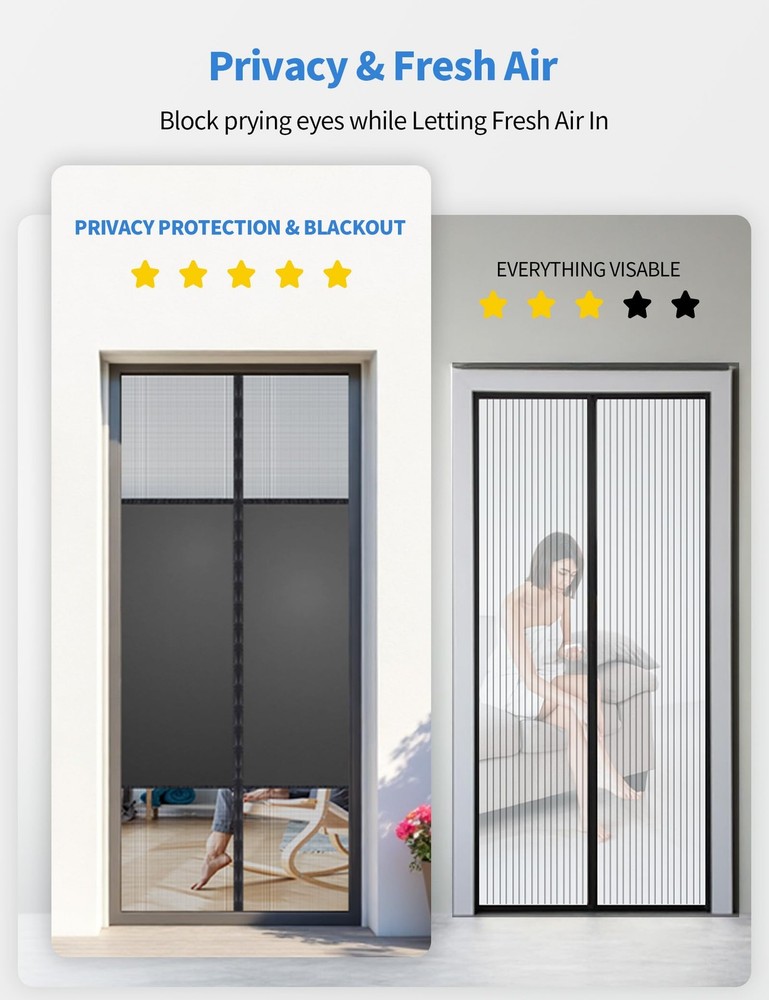 Upgrade your home with our Privacy Magnetic Screen Door, a perfect blend of insect protection, privacy, and ventilation. Unlike traditional screen door mesh, this design features fiberglass mesh on the top and bottom for airflow, while the center section is made of blackout fabric, ensuring enhanced privacy for your home. Whether you need a magnetic screen door for your bedroom, balcony, or patio, this durable fiberglass screen offers a pet-friendly, hands-free solution with a self-closing magnetic seal. Key Features: β Privacy & Protection β Designed for those who want to enjoy fresh air while keeping bugs out and preventing outsiders from peeking in. The blackout fabric center panel ensures full privacy while the breathable fiberglass mesh allows air circulation. πͺ Hands-Free Magnetic Closure β Strong built-in magnets ensure automatic closing after you pass through, making it perfect for kids, pets, and busy households. Say goodbye to constantly opening and closing the door! πΎ Pet-Resistant & Durable Fiberglass Mesh β Crafted from heavy-duty fiberglass, this privacy screen door is scratch-resistant, tear-resistant, and long-lasting, providing superior durability compared to polyester mesh. π Multiple Sizes Available β We offer 5 different sizes to fit standard doors: β Fits 32"x80" doors (Screen size: 34"x81") β Fits 36"x80" doors (Screen size: 38"x81") β Fits 36"x82" doors (Screen size: 38"x83") β Fits 60"x80" doors (Screen size: 62"x81") β Fits 72"x80" doors (Screen size: 74"x81") π§ Easy Installation β Comes with a strong adhesive tape and push pins for added stability. No tools required! Simply attach the screen door in minutes for a secure and seamless fit. Upgrade your home with a Privacy Magnetic Screen Door todayβenjoy fresh air, protect your privacy, and keep insects out effortlessly! Magnetic Screen Door Size: Screen door size: 38 x 81 inch, Fit Door Size: 36 x 80 inch. Great for some front doors, patio doors, and balcony doors. Before purchase, please carefully measure your door size (not include door frame part ) and order the Fit Door Size accordingly. Privacy & Protection in One: Designed with a unique combination of fiberglass mesh on the top and bottom for airflow and a blackout fabric in the middle for enhanced privacy. This privacy screen door keeps bugs out while preventing unwanted views from outside. Hands-Free Entry & Auto Close: The magnetic screen door features a strong self-sealing magnetic closure, allowing hands-free access for kids and pets. The automatic closure ensures a tight seal, keeping your home insect-free. Heavy-Duty & Pet-Friendly: Made of reinforced fiberglass mesh, this screen door mesh is more durable than standard polyester screens, offering superior resistance to wear and pet scratches. Perfect for busy households. Easy & Secure Installation: No tools required! This screen door comes with strong adhesive tape and push pins for extra stability. Simple to install and remove, making it a hassle-free addition to any front door, patio, balcony, or sliding door.