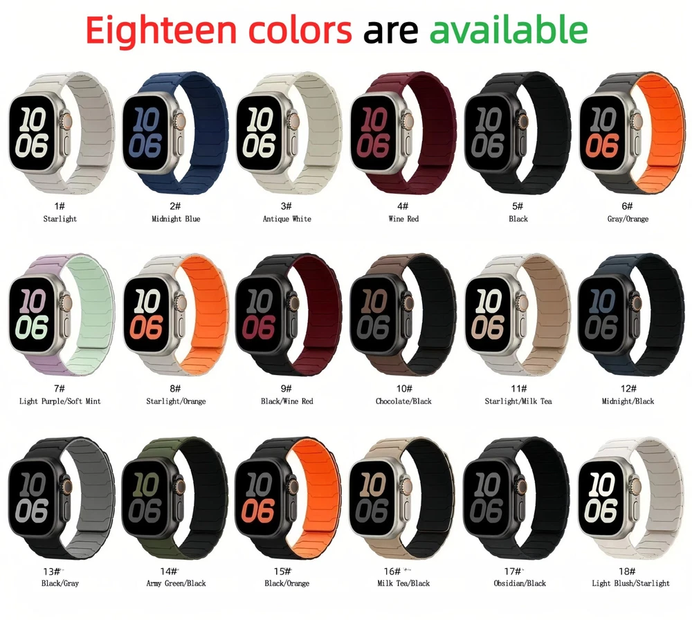 Magnetic Silicone Band for Apple Watch 10 9 8 7 6 5 SE Ultra 2 40/41/42/44/45/46/49mm Features: * 100% Brand new and high quality. * [ COMFORTABLE MATERIAL] The strap is made of soft silicone material covered with multiple suction magnets in one molding process, which can be worn safely and securely on the wrist. * 【 POWERFUL NEODYMIUM MAGNETS 】 keep your Apple Watch safe and secure on your wrist even while playing sports or in wet conditions. Works with any series of Apple Watch from the latest series 10 to the earliest series 1. * 【 FAST AND EASY 】 The soft, skin-friendly silicone material is suitable for all-day wear and is very easy to clean, so simply rinse or wipe it off and it will look like new. * 【 Multiple colors available 】 We offer 18 different colors for you to choose from. Matching different color straps will give your watch a new look and sophistication. Compatible With: > For Apple Watch Ultra / Ultra 2 > For Apple Watch Series 10 / Series 9 / Series 8 / Series 7 / Series 6 / Series 5 / Series 4 / Series 3 / Series 2 / Series 1 / > For Apple Watch Nike > For Apple Watch Hermes > For Apple Watch SE Package includes: 1x Magnetic Silicone Sport Band ONLY !!! ( PS: The Apple Watch is Not Included )