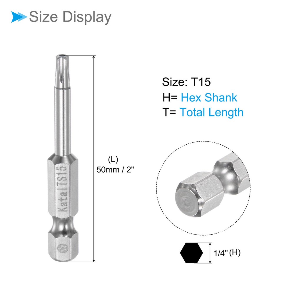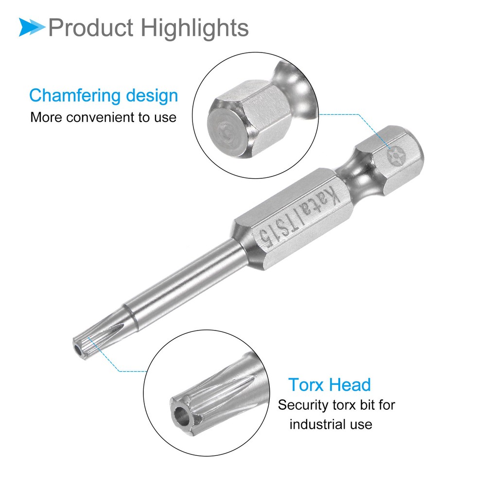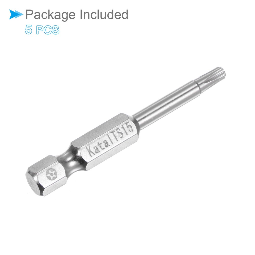 Document Attributes:* Material: S2 Alloy Steel* Size: T15* Hex Shank: 1/4"* Total Length: 50mm / 2"What Is Included:* 5 Pieces x Magnetic Security BitApplications & Features:--- Screwdriver bits set can be used in furniture installation, car maintenance, electronic factory, office installation, kitchen installation, etc.--- The magnetic bit tip can hold the screw securely before installation and after removing the screw to improve efficiency.--- Security bits are made of S2 alloy steel, with good toughness, the surface of the security torx bit set is nickel plating treatment for good anti-rust and wear-resistant and durability, and is suitable for industrial use.Useful Tips:--- Do not turn the screws with mismatched sizes to avoid damage to both the screw and the drill. Magnetic Torx Bits T15 S2 Steel 5 Point Star Screwdriver Bits 5pcs Attributes: * Material: S2 Alloy Steel * Size: T15 * Hex Shank: 1/4" * Total Length: 50mm / 2" What Is Included: * 5 Pieces x Magnetic Security Bit Applications & Features: --- Screwdriver bits set can be used in furniture installation, car maintenance, electronic factory, office installation, kitchen installation, etc. --- The magnetic bit tip can hold the screw securely before installation and after removing the screw to improve efficiency. --- Security bits are made of S2 alloy steel, with good toughness, the surface of the security torx bit set is nickel plating treatment for good anti-rust and wear-resistant and durability, and is suitable for industrial use. Useful Tips: --- Do not turn the screws with mismatched sizes to avoid damage to both the screw and the drill. Hot Item Payment 1.We accept eBay payment . 2.Payment must be received within 7 business days of auction closing. Shipping 1.We ship to your eBay or Paypal address. Please make sure your eBay and Paypal address is correct before you pay. 2.Items will be shipped within 1-3 business day when we received payment. 3.Delivery time depends on destination and other factors. Description Policy Magnetic Torx Bits T15 S2 Steel 5 Point Star Screwdriver Bits 5pcs Attributes: * Material: S2 Alloy Steel * Size: T15 * Hex Shank: 1/4" * Total Length: 50mm / 2" What Is Included: * 5 Pieces x Magnetic Security Bit Applications & Features: --- Screwdriver bits set can be used in furniture installation, car maintenance, electronic factory, office installation, kitchen installation, etc. --- The magnetic bit tip can hold the screw securely before installation and after removing the screw to improve efficiency. --- Security bits are made of S2 alloy steel, with good toughness, the surface of the security torx bit set is nickel plating treatment for good anti-rust and wear-resistant and durability, and is suitable for industrial use. Useful Tips: --- Do not turn the screws with mismatched sizes to avoid damage to both the screw and the drill. Hot Item Payment 1.We accept eBay payment . 2.Payment must be received within 7 business days of auction closing. Shipping 1.We ship to your eBay or Paypal address. Please make sure your eBay and Paypal address is correct before you pay. 2.Items will be shipped within 1-3 business day when we received payment. 3.Delivery time depends on destination and other factors.