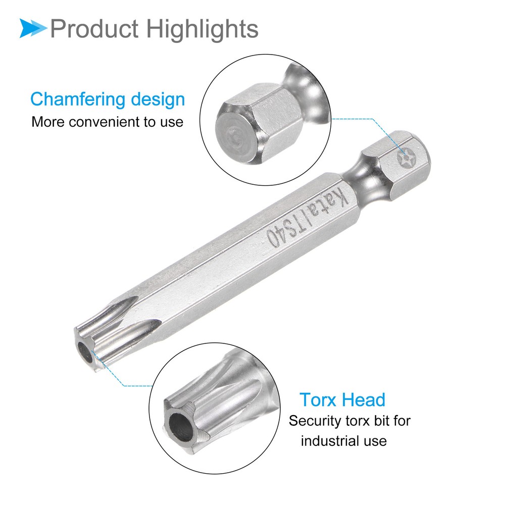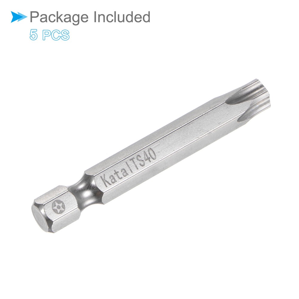 Document Attributes:* Material: S2 Alloy Steel* Size: T40* Hex Shank: 1/4"* Total Length: 50mm / 2"What Is Included:* 5 Pieces x Magnetic Security BitApplications & Features:--- Screwdriver bits set can be used in furniture installation, car maintenance, electronic factory, office installation, kitchen installation, etc.--- The magnetic bit tip can hold the screw securely before installation and after removing the screw to improve efficiency.--- Security bits are made of S2 alloy steel, with good toughness, the surface of the security torx bit set is nickel plating treatment for good anti-rust and wear-resistant and durability, and is suitable for industrial use.Useful Tips:--- Do not turn the screws with mismatched sizes to avoid damage to both the screw and the drill. Magnetic Torx Bits T40 S2 Steel 5 Point Star Screwdriver Bits 5pcs Attributes: * Material: S2 Alloy Steel * Size: T40 * Hex Shank: 1/4" * Total Length: 50mm / 2" What Is Included: * 5 Pieces x Magnetic Security Bit Applications & Features: --- Screwdriver bits set can be used in furniture installation, car maintenance, electronic factory, office installation, kitchen installation, etc. --- The magnetic bit tip can hold the screw securely before installation and after removing the screw to improve efficiency. --- Security bits are made of S2 alloy steel, with good toughness, the surface of the security torx bit set is nickel plating treatment for good anti-rust and wear-resistant and durability, and is suitable for industrial use. Useful Tips: --- Do not turn the screws with mismatched sizes to avoid damage to both the screw and the drill. Hot Item Payment 1.We accept eBay payment . 2.Payment must be received within 7 business days of auction closing. Shipping 1.We ship to your eBay or Paypal address. Please make sure your eBay and Paypal address is correct before you pay. 2.Items will be shipped within 1-3 business day when we received payment. 3.Delivery time depends on destination and other factors. Description Policy Magnetic Torx Bits T40 S2 Steel 5 Point Star Screwdriver Bits 5pcs Attributes: * Material: S2 Alloy Steel * Size: T40 * Hex Shank: 1/4" * Total Length: 50mm / 2" What Is Included: * 5 Pieces x Magnetic Security Bit Applications & Features: --- Screwdriver bits set can be used in furniture installation, car maintenance, electronic factory, office installation, kitchen installation, etc. --- The magnetic bit tip can hold the screw securely before installation and after removing the screw to improve efficiency. --- Security bits are made of S2 alloy steel, with good toughness, the surface of the security torx bit set is nickel plating treatment for good anti-rust and wear-resistant and durability, and is suitable for industrial use. Useful Tips: --- Do not turn the screws with mismatched sizes to avoid damage to both the screw and the drill. Hot Item Payment 1.We accept eBay payment . 2.Payment must be received within 7 business days of auction closing. Shipping 1.We ship to your eBay or Paypal address. Please make sure your eBay and Paypal address is correct before you pay. 2.Items will be shipped within 1-3 business day when we received payment. 3.Delivery time depends on destination and other factors.