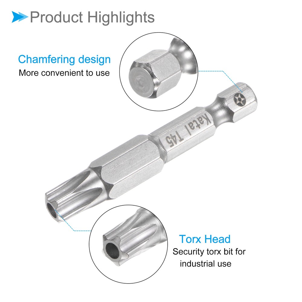 Document Attributes:* Material: S2 Alloy Steel* Size: T45* Hex Shank: 1/4"* Total Length: 50mm / 2"What Is Included:* 1 Piece x Magnetic Security BitApplications & Features:--- Screwdriver bits set can be used in furniture installation, car maintenance, electronic factory, office installation, kitchen installation, etc.--- The magnetic bit tip can hold the screw securely before installation and after removing the screw to improve efficiency.--- Security bits are made of S2 alloy steel, with good toughness, the surface of the security torx bit set is nickel plating treatment for good anti-rust and wear-resistant and durability, and is suitable for industrial use.Useful Tips:--- Do not turn the screws with mismatched sizes to avoid damage to both the screw and the drill. Magnetic Torx Bits T45 S2 Steel 5 Point Star Screwdriver Bits Attributes: * Material: S2 Alloy Steel * Size: T45 * Hex Shank: 1/4" * Total Length: 50mm / 2" What Is Included: * 1 Piece x Magnetic Security Bit Applications & Features: --- Screwdriver bits set can be used in furniture installation, car maintenance, electronic factory, office installation, kitchen installation, etc. --- The magnetic bit tip can hold the screw securely before installation and after removing the screw to improve efficiency. --- Security bits are made of S2 alloy steel, with good toughness, the surface of the security torx bit set is nickel plating treatment for good anti-rust and wear-resistant and durability, and is suitable for industrial use. Useful Tips: --- Do not turn the screws with mismatched sizes to avoid damage to both the screw and the drill. Hot Item Payment 1.We accept eBay payment . 2.Payment must be received within 7 business days of auction closing. Shipping 1.We ship to your eBay or Paypal address. Please make sure your eBay and Paypal address is correct before you pay. 2.Items will be shipped within 1-3 business day when we received payment. 3.Delivery time depends on destination and other factors. Description Policy Magnetic Torx Bits T45 S2 Steel 5 Point Star Screwdriver Bits Attributes: * Material: S2 Alloy Steel * Size: T45 * Hex Shank: 1/4" * Total Length: 50mm / 2" What Is Included: * 1 Piece x Magnetic Security Bit Applications & Features: --- Screwdriver bits set can be used in furniture installation, car maintenance, electronic factory, office installation, kitchen installation, etc. --- The magnetic bit tip can hold the screw securely before installation and after removing the screw to improve efficiency. --- Security bits are made of S2 alloy steel, with good toughness, the surface of the security torx bit set is nickel plating treatment for good anti-rust and wear-resistant and durability, and is suitable for industrial use. Useful Tips: --- Do not turn the screws with mismatched sizes to avoid damage to both the screw and the drill. Hot Item Payment 1.We accept eBay payment . 2.Payment must be received within 7 business days of auction closing. Shipping 1.We ship to your eBay or Paypal address. Please make sure your eBay and Paypal address is correct before you pay. 2.Items will be shipped within 1-3 business day when we received payment. 3.Delivery time depends on destination and other factors.
