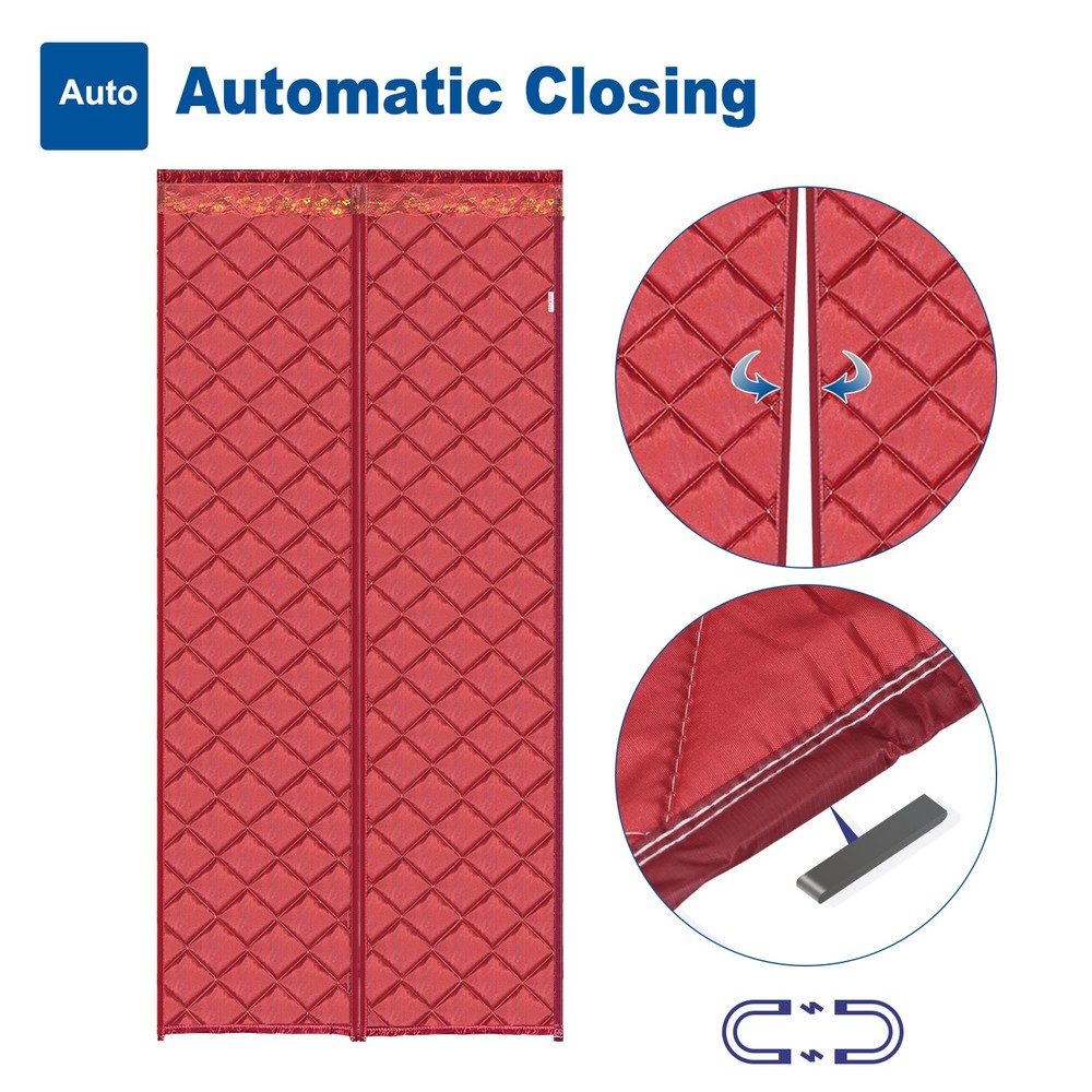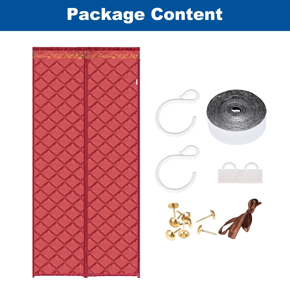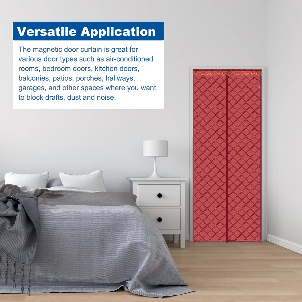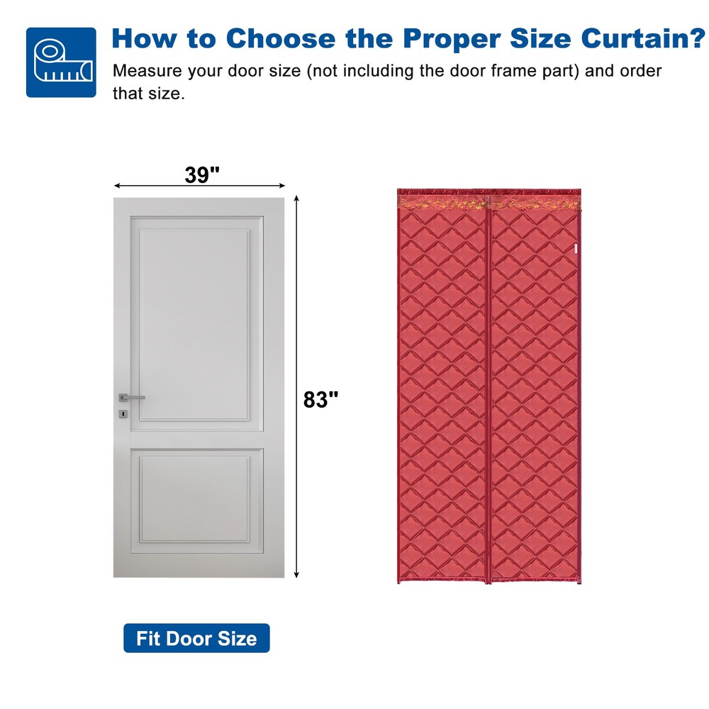 Document Fits Door Sizes 35.5" x 79": The magnetic insulated door curtain fits your door size 35.5" x 79". Before purchasing, please carefully measure your door size (not including the door frame part) and order that size.Quality Materials: The surface of the insulated door curtain is made of waterproof Oxford cloth material, and the interior is filled with thick enough soft silk cotton, which is durable, wear-resistant, weatherproof and soundproof.Thermal Insulation and Noise Reduction: Our magnetic insulated curtain can block the penetration of cold winter wind and hot summer air, helping to keep a comfortable indoor temperature. It can also be used for sound insulation, reducing external noise and creating a quieter environment for you.Automatic Closing: The magnetic self-closing design provides you with a great experience of hands-free opening and quiet automatic closing. It's easy to push through even with items in hand and seals quickly and quietly once through. The magnetic closure and thick material provide a layer of privacy, blocking external visibility.Versatile Application: The magnetic door curtain is great for various door types such as air-conditioned rooms, bedroom doors, kitchen doors, balconies, patios, porches, hallways, garages, and other spaces where you want to block drafts, dust and noise.Specification:Material: Oxford, Silk CottonFits Door Size: 90 x 200cm/35.5" x 79"(W*H)Package Content: 1 x Magnetic Thermal Insulated Door Curtain, Some Installation Parts Magnetic Thermal Insulated Door Curtain Fits Door Size 39" x 83", Red Fits Door Sizes 35.5" x 79": The magnetic insulated door curtain fits your door size 35.5" x 79". Before purchasing, please carefully measure your door size (not including the door frame part) and order that size. Quality Materials: The surface of the insulated door curtain is made of waterproof Oxford cloth material, and the interior is filled with thick enough soft silk cotton, which is durable, wear-resistant, weatherproof and soundproof. Thermal Insulation and Noise Reduction: Our magnetic insulated curtain can block the penetration of cold winter wind and hot summer air, helping to keep a comfortable indoor temperature. It can also be used for sound insulation, reducing external noise and creating a quieter environment for you. Automatic Closing: The magnetic self-closing design provides you with a great experience of hands-free opening and quiet automatic closing. It's easy to push through even with items in hand and seals quickly and quietly once through. The magnetic closure and thick material provide a layer of privacy, blocking external visibility. Versatile Application: The magnetic door curtain is great for various door types such as air-conditioned rooms, bedroom doors, kitchen doors, balconies, patios, porches, hallways, garages, and other spaces where you want to block drafts, dust and noise. Specification: Material: Oxford, Silk Cotton Fits Door Size: 90 x 200cm/35.5" x 79"(W*H) Package Content: 1 x Magnetic Thermal Insulated Door Curtain, Some Installation Parts Hot Item Payment We accept eBay payment. Please do not email us to ask for other payment option. We appreciate prompt payment and look forward to your business in the future. Unpaid item will be filed without receiving payment in 7 days from listing ended. Shipping Usually we ship your order out within 24 hours in business day. For shipping and handling charges (S&H) for specific item, please refer to the item listing page for more details. Please make sure your shipping address is correct. We are not responsible for any loss in transit if a wrong address is provided. Return Policy Returns for exchange are permitted and must be initiated by the buyer within 30 days upon receipt. If you would like to return your product(s) for repair / replacement / refund, please kindly contact our customer service representatives via email for an authorized RMA number. Your returned product(s) will not be processed without a completed RMA. About Us We are continually expanding our product selection to better serve your need. We look forward to providing the best sevice to you - our dear customers, so take a look around our store and find the product that you want. You can put your trust in us! If you need any help or have any suggestions, please don't hesititate to contact us anytime , we will reply you within 24 hours and try the best to help you. Description Policy Magnetic Thermal Insulated Door Curtain Fits Door Size 39" x 83", Red Fits Door Sizes 35.5" x 79": The magnetic insulated door curtain fits your door size 35.5" x 79". Before purchasing, please carefully measure your door size (not including the door frame part) and order that size. Quality Materials: The surface of the insulated door curtain is made of waterproof Oxford cloth material, and the interior is filled with thick enough soft silk cotton, which is durable, wear-resistant, weatherproof and soundproof. Thermal Insulation and Noise Reduction: Our magnetic insulated curtain can block the penetration of cold winter wind and hot summer air, helping to keep a comfortable indoor temperature. It can also be used for sound insulation, reducing external noise and creating a quieter environment for you. Automatic Closing: The magnetic self-closing design provides you with a great experience of hands-free opening and quiet automatic closing. It's easy to push through even with items in hand and seals quickly and quietly once through. The magnetic closure and thick material provide a layer of privacy, blocking external visibility. Versatile Application: The magnetic door curtain is great for various door types such as air-conditioned rooms, bedroom doors, kitchen doors, balconies, patios, porches, hallways, garages, and other spaces where you want to block drafts, dust and noise. Specification: Material: Oxford, Silk Cotton Fits Door Size: 90 x 200cm/35.5" x 79"(W*H) Package Content: 1 x Magnetic Thermal Insulated Door Curtai
