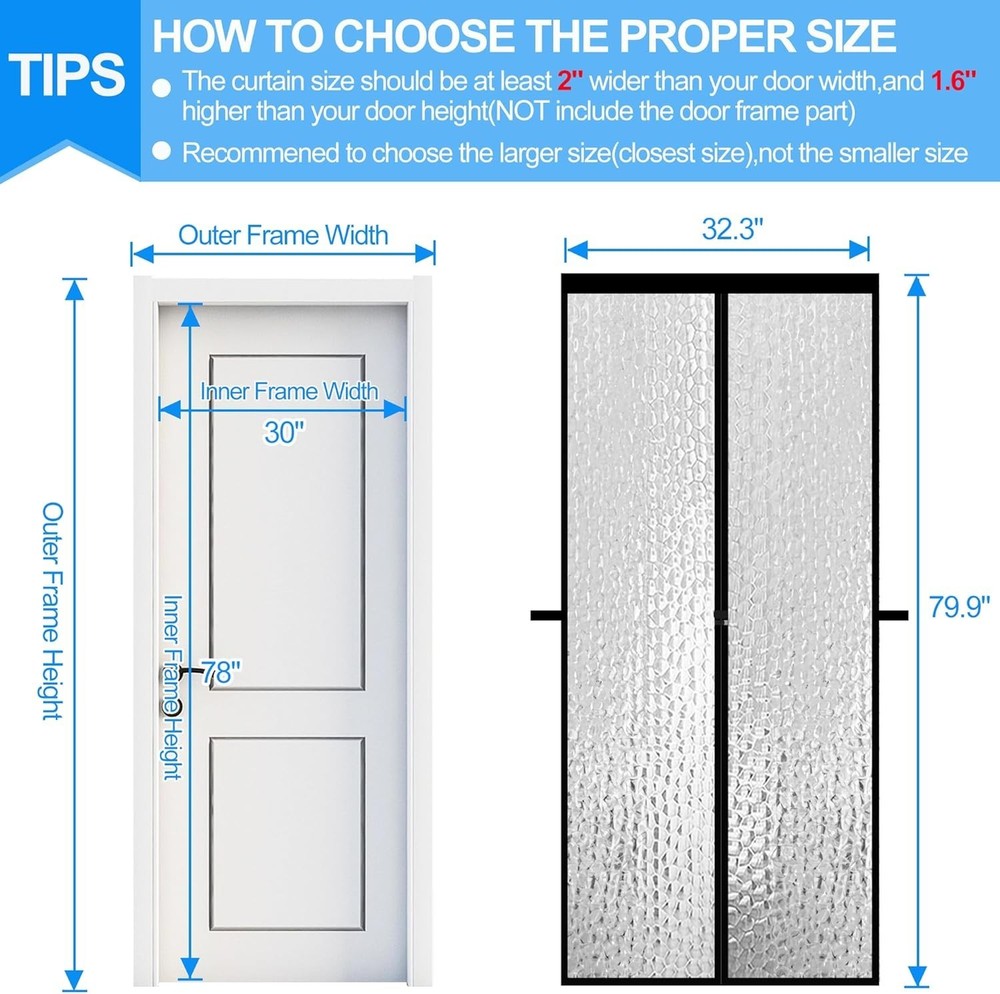 Magnetic Thermal Insulated Door Curtain,Waterproof EVA Door Cover,Fit Doors Size Up to 30"x78",Temperature Protection Insulated Doorway Curtain Partition,Patio Self-Closing Doors Net Screen How To Choose The Proper Size:Actual door curtain "W x "H,included velcro-edges,fits door size max to:30''W x 78''H (without door frame) !The curtain size should be at least 2" wider than your door width,and " higher than your door height(NOT include the door frame part).Use the dimensions of the inner door frame to add 2" in width and " in height to select the appropriate size!Recommened to select the larger size(closest size),not the smaller size Eco-friendly EVA Insulated Material:Our thermal door curtain is made of EVA plastic insulated material which effectively block the hot or cold wind from coming into the room and maintain the temperature inside.Features excellent heat resistance and cold resistance,will not deform or shatter even after prolonged exposure in summer or in winter!Please rest at ease,ultra-high purity EVA materials is non-toxic,odorless and does not contain any harmful substances,100% safe for your kids and pets 50 Powerful Magnets&4 Weighted Blocks:The doorways curtain is equipped with 50pcs strong magnetic blocks which are sewn right into the seams along the entire curtain length to ensure fast,automatic and silent closure,offer better sealing performance!Extra 4 large and heavy gravity sticks are added into the curtain bottom to improve the wind resistance ability!The magnetic self-closing design offers you a great experience with hands-free opening,which is also very friendly to your kids and pets " Widened Top Hook&Loop Strip:While other insulated door net screens have only " narrow hook&loop strip,we adopt widened and reinforced " wide hook&loop strips on the top,which increases contact surface and effectively enhances the adhesion to prevent falling off and makes installation more easier!The entire frame of the door curtain is wrapped with widened webbing and reinforced by double-stitched seam to prevent the screen curtain from loosening or tearing for longer life Good Light Transmittance:Translucent color with diamond pattern,light transmittance up to 70%,our magnetic self-closing doorway cover strikes the perfect balance between waterproof,windproof,rainproof,snowproof and good clear visibility!It can act as an excellent barrier against those pesky insects,flies,leaves,debris,dust,dirt and other unwanted guests while not sacrificing visibility,it also can works as a temporary door to insulate one room from another,while giving a misty beauty