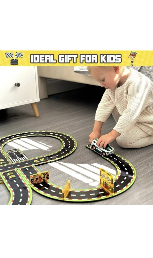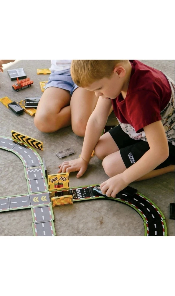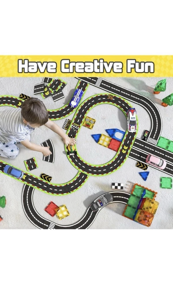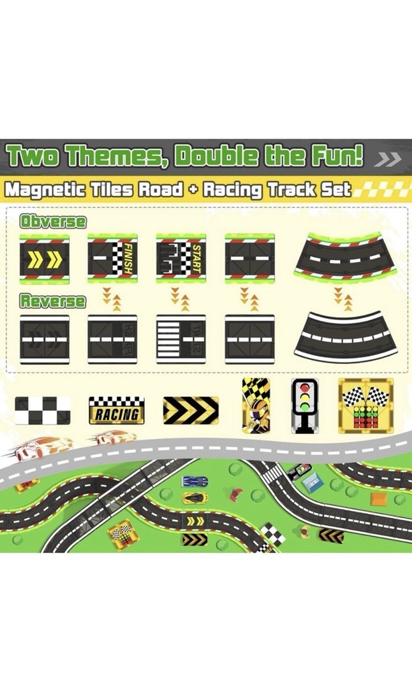 This product is a Magnetic Tiles Racing Track and City Road Expansion Pack by Coodoo. It is a STEM toy designed for kids, featuring magnetic tiles that can be used to build racing tracks and city roads. It encourages creativity and imagination in children while also promoting learning in the fields of science, technology, engineering, and mathematics (STEM). Magnetic Tiles Racing Track & City Road Expansion Pack - Kids Toys STEM Learning Montessori Toys for Toddler Magnetic Blocks Building Toys for 3+ Year Old Boys & Girls, Sensory Play Kids Toys