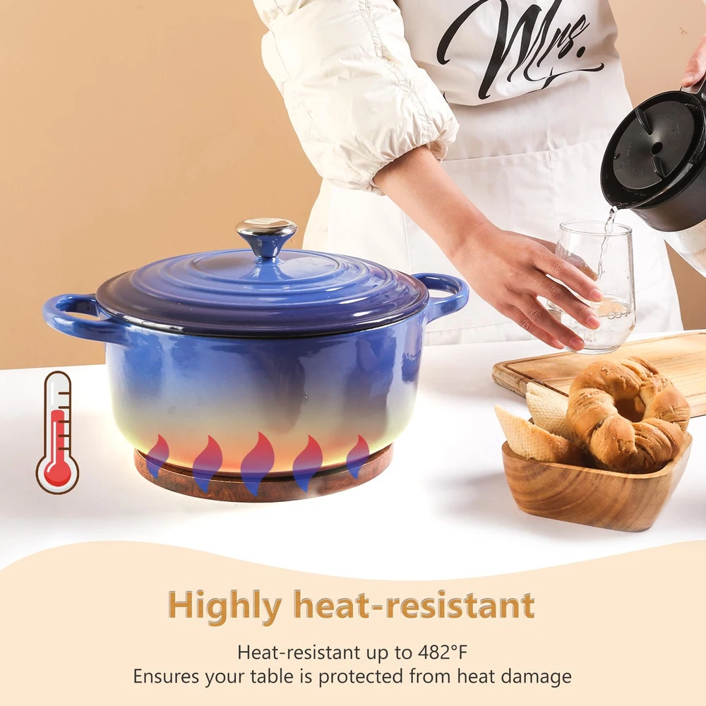 Fashionable Application: This magnetic wooden trivet is specifically designed for your Le Creuset, Staub Enameled, and Lodge Cast Iron Dutch Ovens, as well as any cookware with a magnetic metal bottom layer. It is meticulously crafted with beautiful acacia wood, adding a touch of elegance to your kitchen countertop while providing a sturdy base for your cast iron pots or pans. You can also gift our magnetic wooden trivet to someone special. Upgraded Magnetic Adhesion: Our 8-inch magnetic trivet is equipped with strong magnets that instantly adhere to the bottom of your metal cookware, securely holding it in place for easy transition from oven to table. With this magnetic wooden trivet, you can effortlessly move your cookware in a hands-free manner while effectively protecting surfaces from heat. (Doesn't work with aluminum pans, so only buy this if you have cast iron, stainless steel, copper, etc. If a magnet sticks to your pan, this will work.) Heat-resistant&Silicone Ring Design: Our magnetic wooden trivet features three iconic food-grade silicone rings on the top, free from BPA, resistant to stains, odors, and flavor absorption. They provide heat-resistant cushioning support and non-slip grip, allowing air to circulate around pots and pans, preventing condensation and stains from forming on the bottom, and protecting your countertop from damage. Additionally, it has high heat resistance and can withstand temperatures up to 482°F, ensuring your table remains unharmed. Premium Material: Our magnetic wooden trivet is made of high-quality acacia wood sourced from Taiwan, known for its unique and charming grain patterns and natural brown finish. Each piece of wood has its own distinct pattern and tone. This hardwood is durable and resistant to breaking or splitting, withstanding daily use and wear. Its natural resistance to corrosion and pests ensures that the magnetic wooden trivet remains in good condition even in humid environments, without being susceptible to insect damage. One-year Warranty: We offer a one-year warranty. From product design, material selection, to manufacturing processes, we always strive for excellence and innovation to meet customer expectations and demands. If you encounter any issues with our product, please feel free to contact us, and we will provide a free replacement. We sincerely value your feedback and aim to address any concerns or make improvements to our product. NOTE: The magnetic feature of the wooden trivet allows for convenient storage. When not in use, you can secure the trivet to any magnetic surface, such as the side of a refrigerator or a metal cabinet, saving space in your kitchen. Don't put the pot back on the stove without taking the trivet off. It gets hidden and you simply forget.