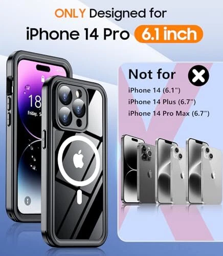 Return Policy Fast Delivery Trusted seller Magnetic for iPhone 14 Pro Case Waterproof,Built-in Screen Protector[IP68 Underwater][Upgrade Military Dropproof][Compatible with MagSafe] Full Body Shockproof for Phone Case 6.1'' - Black Product Description 【IP68 Waterproof】The iPhone14 Pro case is certified with an IP68 waterproof rating, allowing it to be submerged up to 10ft/3m for one hour while providing protection against dust, dirt, water, snow, and rain. Its comprehensive body protection design enables underwater photography and videography. Additionally, the washable feature facilitates easy cleaning, ensuring that both your phone and case maintain a pristine appearance while safeguarding against scratches and fading 【360 Full Body Protection】The iPhone 14 Pro shockproof case has been rigorously tested to exceed Military Grade Drop Test standards at heights of over. Constructed from premium TPU/PC and PET materials with a specialized double-layer frame, this case s maximum durability without yellowing over time. The four anti-collision corners are designed to disperse up to 99% of impact force, effectively protecting your device from damage. Furthermore, this durable iPhone 14 Pro case includes a detachable lanyard to prevent accidental drops 【Strong Magnet & Secure Grip】The MagSafe-compatible case for the iPhone 14 Pro features a robust magnetic ring that enhances connectivity with most MagSafe accessories such as wireless chargers, magnetic car mounts, battery banks, wallets, and more. This allows you to charge without removing the case; perfectly aligned magnets facilitate faster and easier wireless charging than ever before while providing a secure grip 【Ultra-Clear Original Sound Quality】Meticulously engineered for precise alignment with speakers, buttons, and cutouts on the iPhone 14 Pro case ensures optimal sound quality. The upgraded design allows simultaneous access to both the silicone plug covering the bottom sound hole and the charging port cover for improved call clarity—without compromising volume levels—enabling uninterrupted music enjoyment along with clearer call quality through our protective cg. Note: The special button is not scrollable for zooming in/out; it is intended solely for taking photos 【HD Built-in Screen & Camera Protector】This iPhone 14 Pro waterproof case incorporates a built-in screen protector made of tempered glass measuring just 0.33mm thick which maintains an impressive response sensitivity of 99.99% without scratching easily. A specially crafted black camera lens protector offers substantial defense against high-impact forces while enhancing photo aesthetics by preserving image clarity; its thoughtful design includes raised lips measuring 2.5mm around the camera area and bezels of approximately 1.5mm surrounding the back screen—providing extensive overall protection Shipping Returns Payment Shipping Shipping is FREE to all addresses other than APO/PO boxes in the lower 48 states. All our stock ships from US-based warehouses. Shipped via USPS or UPS (depending on location and package weight) Unless stated otherwise, all orders will ship within 24-72 hours of your payment being processed. Check our feedback to see the great reviews of FAST shipping we offer. Returns Seller does not accept returns Payment We currently accept payment via eBay managed payments only. Once payment is cleared, we will dispatch your shipment within 1-3 business days. Please refer to the "Shipping" tab for more information regarding shipping speed to your destination.
