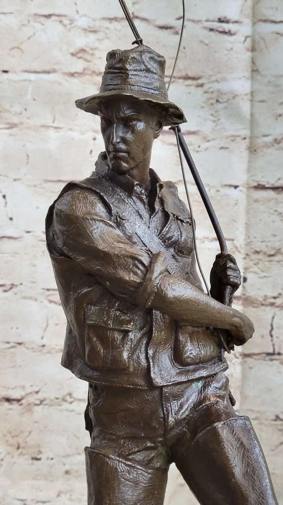 Condition : This sculpture is in perfect condition. Bronze Dimensions with Marble Base: Height 16" X Width 8" Marble Dimensions: Diameter 8" Height without base:15" Weight:10 LBS Inventory:27X24684972 Witness the struggle for survival captured in exquisite bronze artistry with this poignant sculpture. Depicting a man's determination as he fishes with a simple stick, this artwork portrays the resilience of human spirit in the face of adversity. The man's attire, complete with a protective hat and a small bag, underscores his resourcefulness and his battle against the elements while navigating the challenging river. Crafted using the age-old method of lost-wax casting, this sculpture embodies the artist's commitment to preserving the intricate details of the scene. The brown patina finish not only enhances the sculpture's aesthetic appeal but also adds a touch of timelessness to the narrative it conveys. Resting on a sturdy black marble base, this artwork stands as a testament to human fortitude and the enduring power of art to capture the essence of human experience. Signed by the artist Thomas, this bronze sculpture invites viewers to contemplate the struggles and triumphs that define our existence. Whether displayed in a collection or as a standalone piece, it serves as a reminder of the resilience within us all and the stories that art can uniquely convey. Signed Original English Thomas Fisherman Fish Bronze Sculpture Statue Figurine www.bronzhaus.com Video will open in a new window Using the eBay App? Paste link into a browser window: [isdntekvideo]
